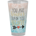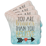 This design features one of our many inspirational quotes. This quote in particular reminds you that "you are braver than you believe." This uplifting quote has beatuiful and playful fonts to create it. An arrow sits below the quote to symbolize the bravery of the heart. The background is a lovely hombre watercolor pattern of teal/turquoise and peach. The calming colors make for a lovely inspirational design.