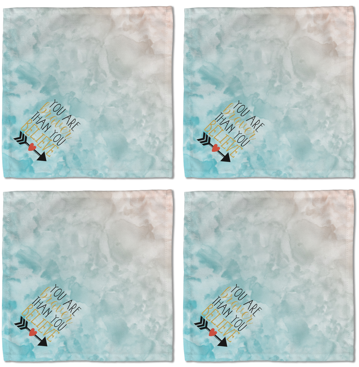 Each customizable cloth napkin is a polyester material guaranteed for long-term use. Since our napkins are cloth, it serves as a great reusable and eco-friendly dining decor. We sell personalized napkins individually or as a set of 4! Print your own unique design on all four napkins, or create four individual designs for each napkin! We offer two different napkin sizes - Cocktail napkins (approx. 10 x 10) and Dinner napkins (approx. 20 x 20). We print your design on one side, perfect for displaying your custom designed lunch napkins in any fold or table setting!