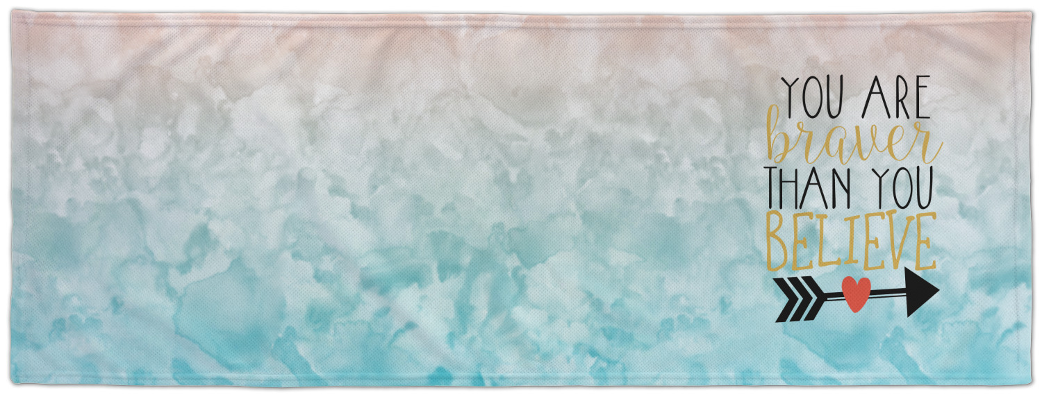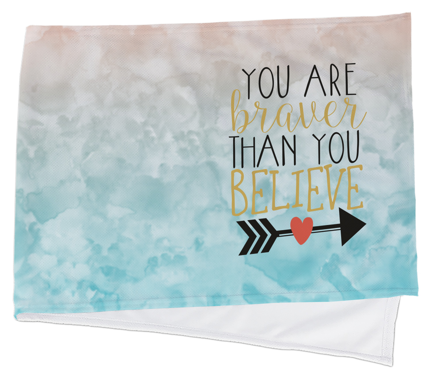 This design features one of our many inspirational quotes. This quote in particular reminds you that "you are braver than you believe." This uplifting quote has beatuiful and playful fonts to create it. An arrow sits below the quote to symbolize the bravery of the heart. The background is a lovely hombre watercolor pattern of teal/turquoise and peach. The calming colors make for a lovely inspirational design.