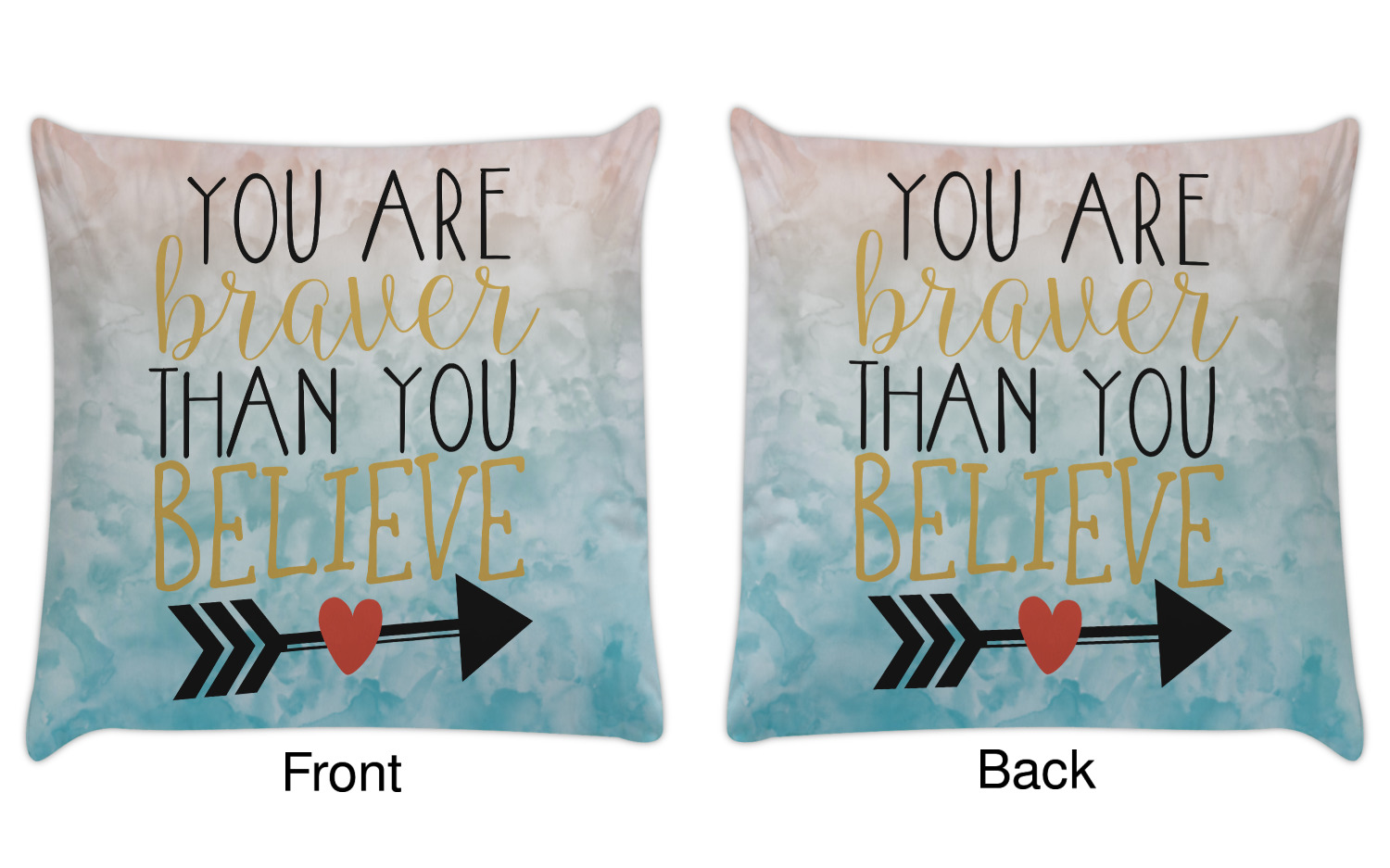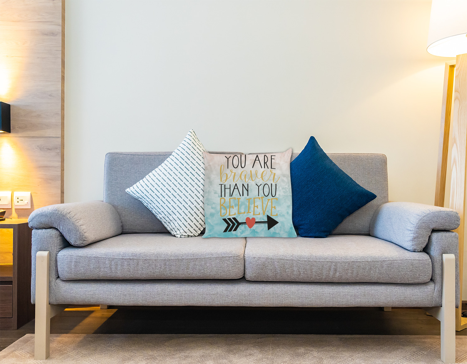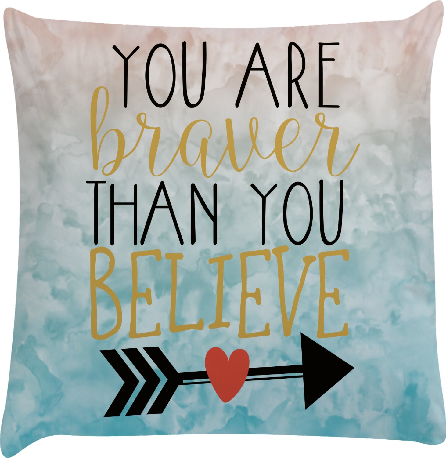 This design features one of our many inspirational quotes. This quote in particular reminds you that "you are braver than you believe." This uplifting quote has beatuiful and playful fonts to create it. An arrow sits below the quote to symbolize the bravery of the heart. The background is a lovely hombre watercolor pattern of teal/turquoise and peach. The calming colors make for a lovely inspirational design.