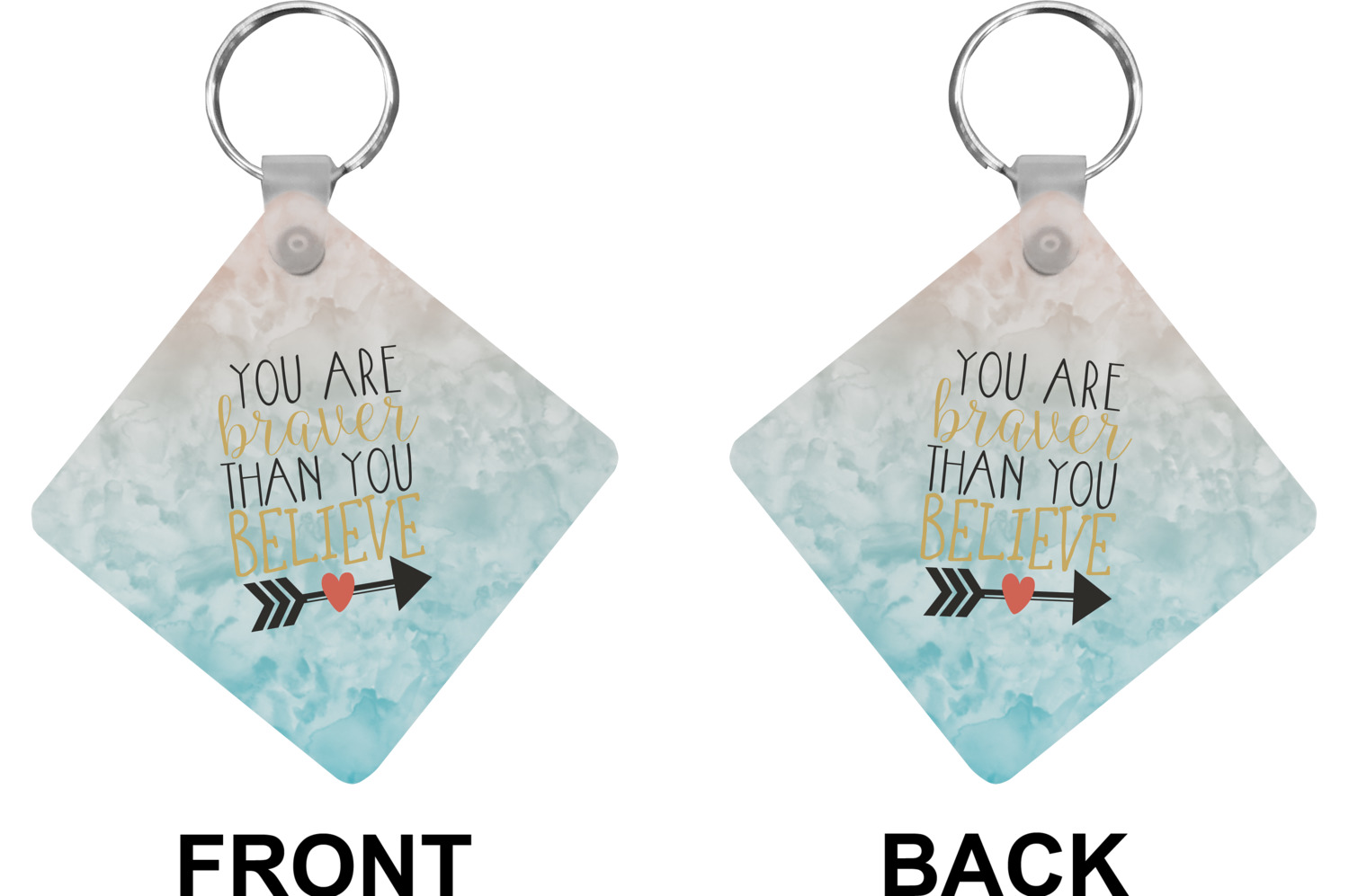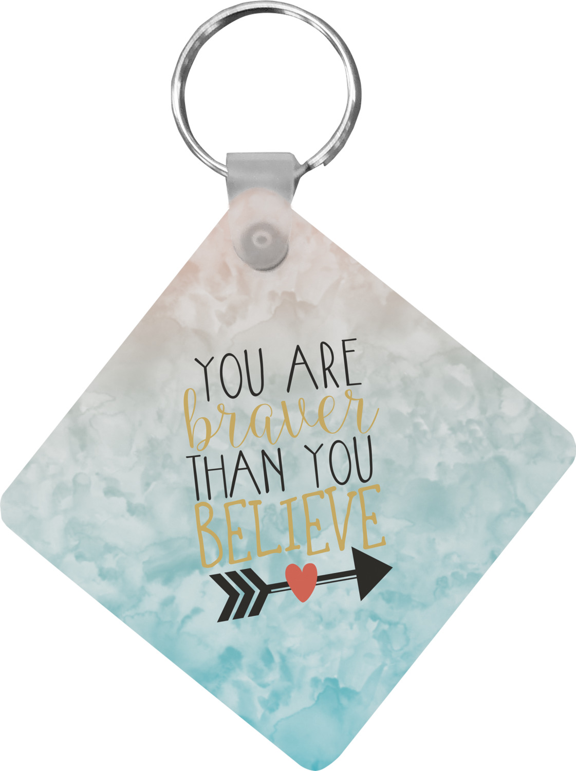 This design features one of our many inspirational quotes. This quote in particular reminds you that "you are braver than you believe." This uplifting quote has beatuiful and playful fonts to create it. An arrow sits below the quote to symbolize the bravery of the heart. The background is a lovely hombre watercolor pattern of teal/turquoise and peach. The calming colors make for a lovely inspirational design.