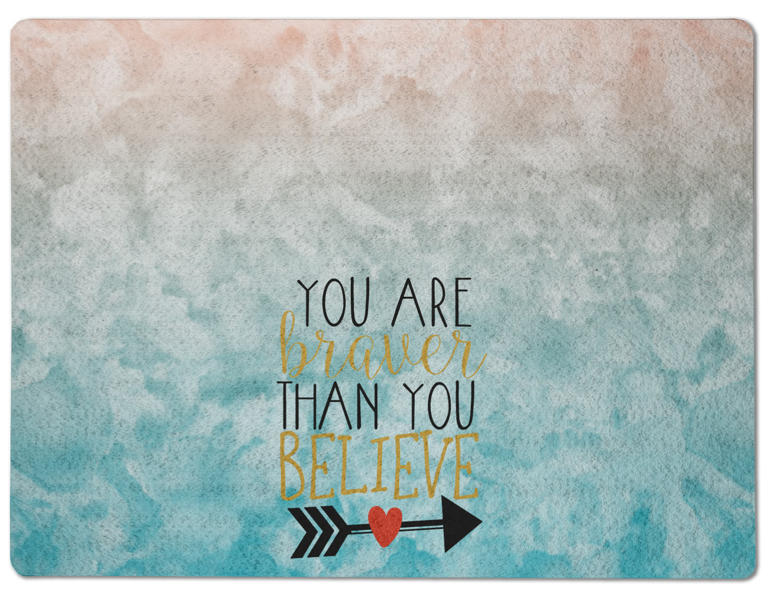 This design features one of our many inspirational quotes. This quote in particular reminds you that "you are braver than you believe." This uplifting quote has beatuiful and playful fonts to create it. An arrow sits below the quote to symbolize the bravery of the heart. The background is a lovely hombre watercolor pattern of teal/turquoise and peach. The calming colors make for a lovely inspirational design.