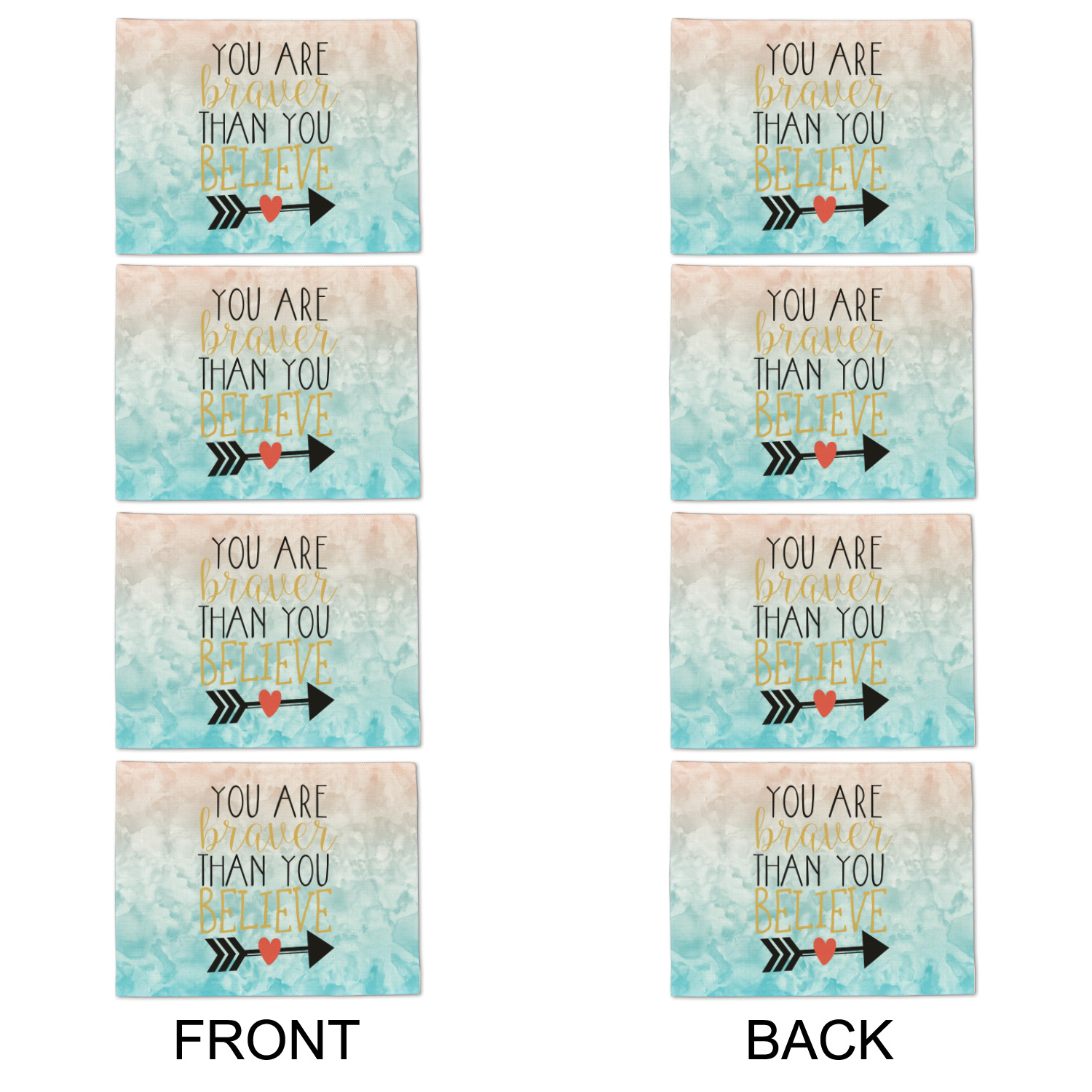 This design features one of our many inspirational quotes. This quote in particular reminds you that "you are braver than you believe." This uplifting quote has beatuiful and playful fonts to create it. An arrow sits below the quote to symbolize the bravery of the heart. The background is a lovely hombre watercolor pattern of teal/turquoise and peach. The calming colors make for a lovely inspirational design.