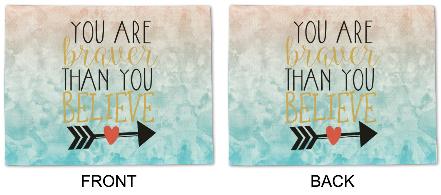 This design features one of our many inspirational quotes. This quote in particular reminds you that "you are braver than you believe." This uplifting quote has beatuiful and playful fonts to create it. An arrow sits below the quote to symbolize the bravery of the heart. The background is a lovely hombre watercolor pattern of teal/turquoise and peach. The calming colors make for a lovely inspirational design.