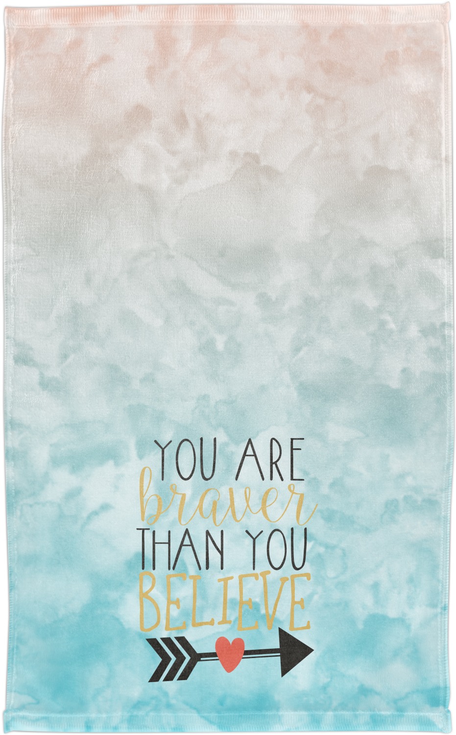 This design features one of our many inspirational quotes. This quote in particular reminds you that "you are braver than you believe." This uplifting quote has beatuiful and playful fonts to create it. An arrow sits below the quote to symbolize the bravery of the heart. The background is a lovely hombre watercolor pattern of teal/turquoise and peach. The calming colors make for a lovely inspirational design.