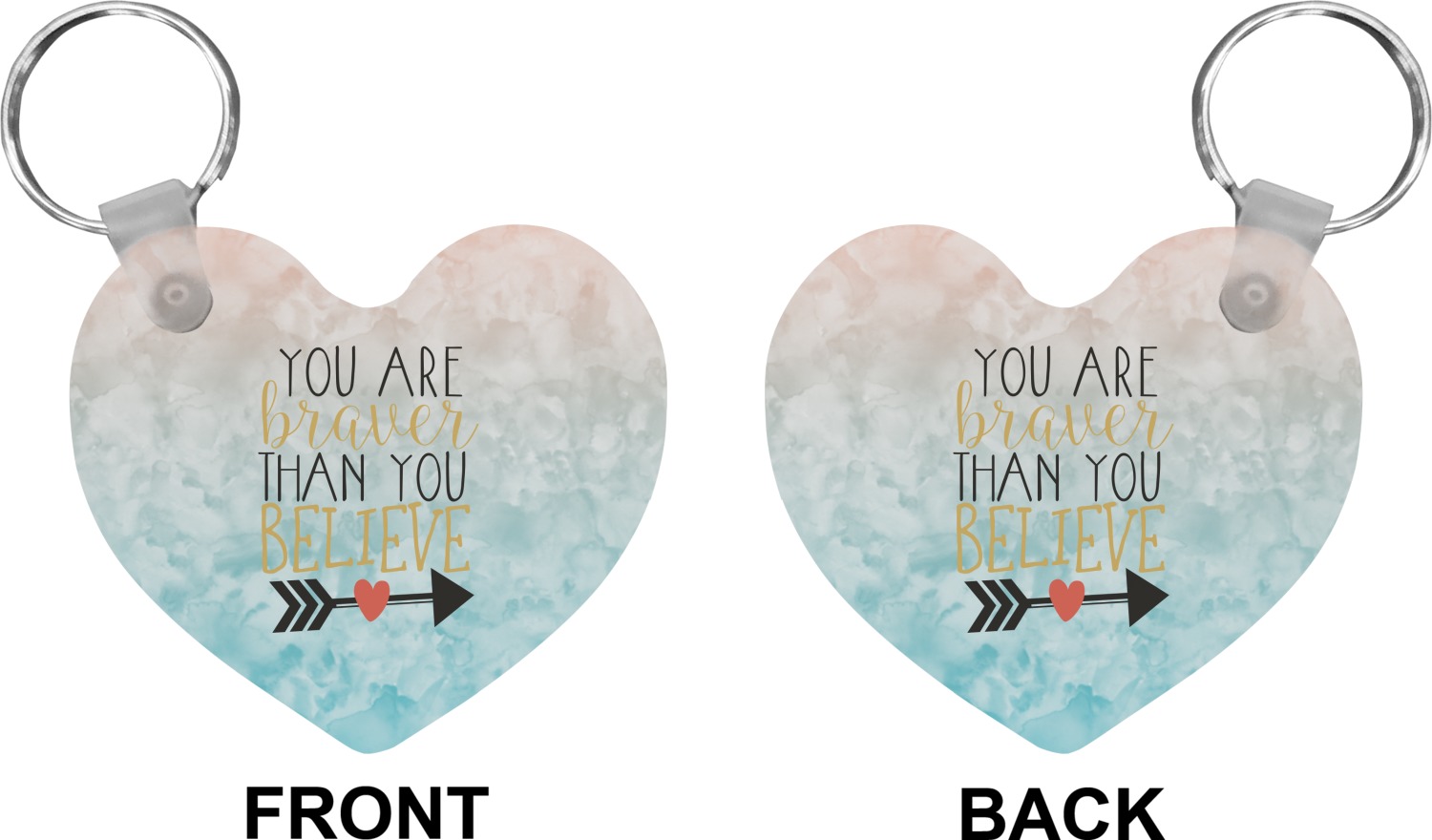 This design features one of our many inspirational quotes. This quote in particular reminds you that "you are braver than you believe." This uplifting quote has beatuiful and playful fonts to create it. An arrow sits below the quote to symbolize the bravery of the heart. The background is a lovely hombre watercolor pattern of teal/turquoise and peach. The calming colors make for a lovely inspirational design.