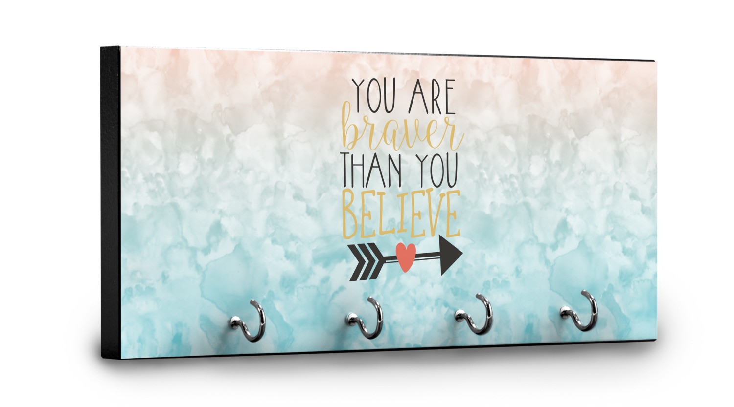This design features one of our many inspirational quotes. This quote in particular reminds you that "you are braver than you believe." This uplifting quote has beatuiful and playful fonts to create it. An arrow sits below the quote to symbolize the bravery of the heart. The background is a lovely hombre watercolor pattern of teal/turquoise and peach. The calming colors make for a lovely inspirational design.
