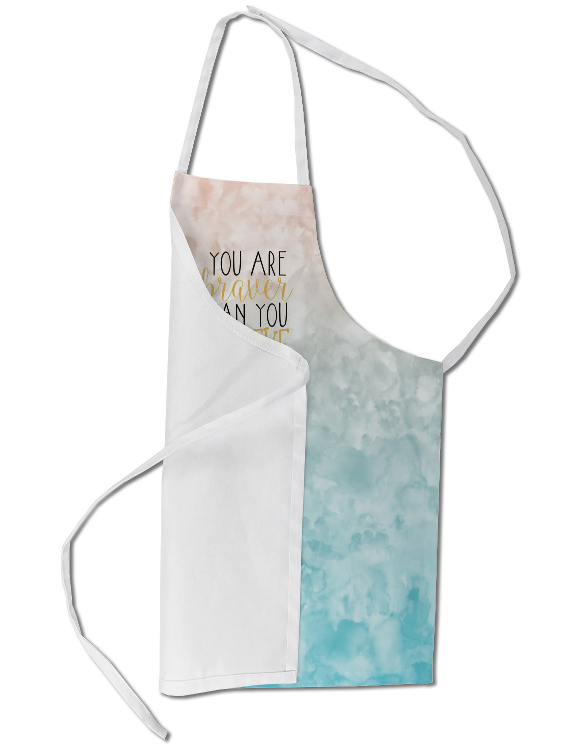 This design features one of our many inspirational quotes. This quote in particular reminds you that "you are braver than you believe." This uplifting quote has beatuiful and playful fonts to create it. An arrow sits below the quote to symbolize the bravery of the heart. The background is a lovely hombre watercolor pattern of teal/turquoise and peach. The calming colors make for a lovely inspirational design.