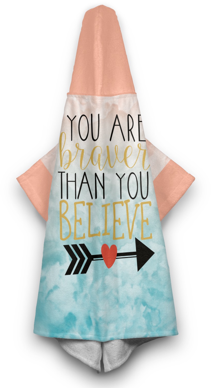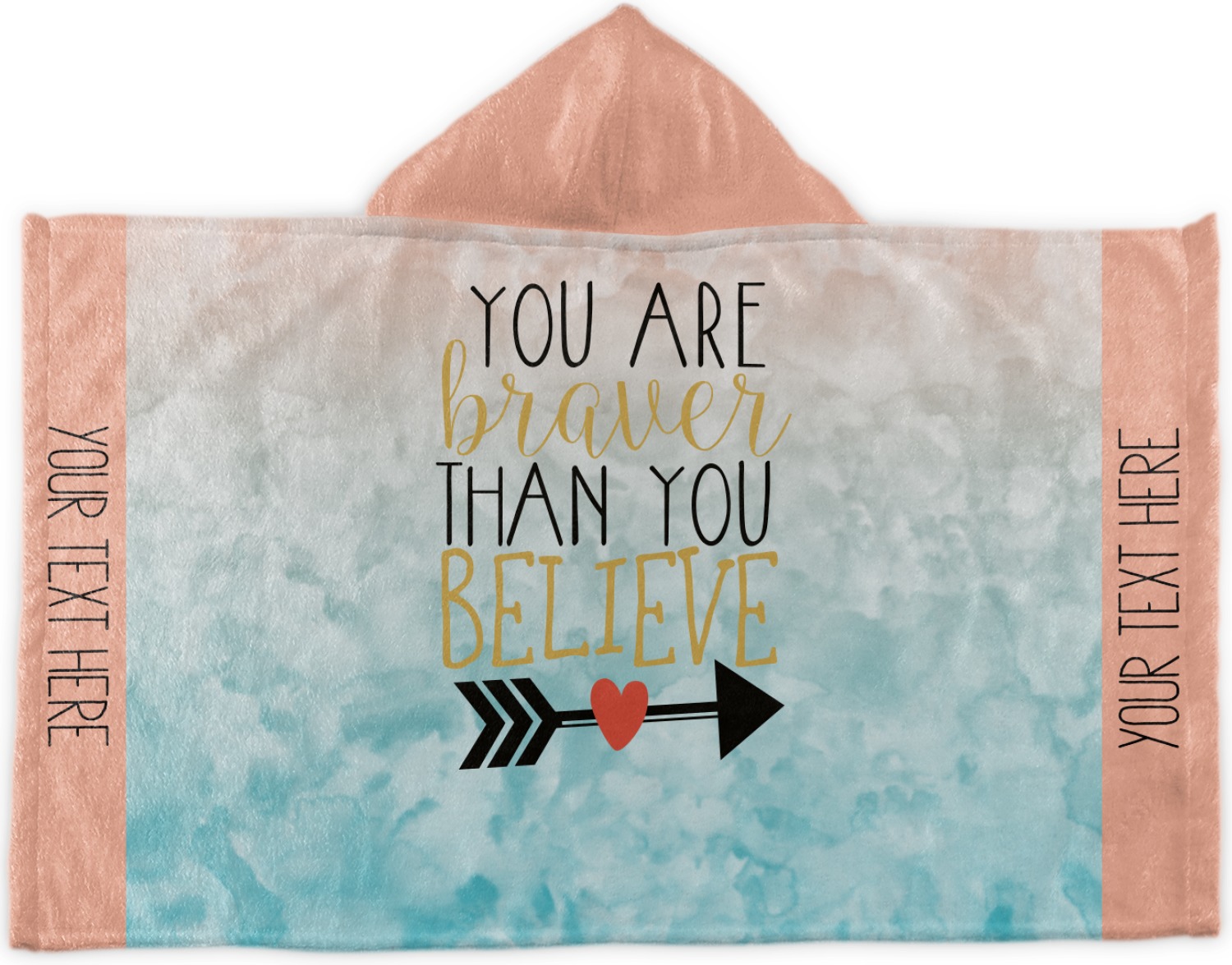 This design features one of our many inspirational quotes. This quote in particular reminds you that "you are braver than you believe." This uplifting quote has beatuiful and playful fonts to create it. An arrow sits below the quote to symbolize the bravery of the heart. The background is a lovely hombre watercolor pattern of teal/turquoise and peach. The calming colors make for a lovely inspirational design.
