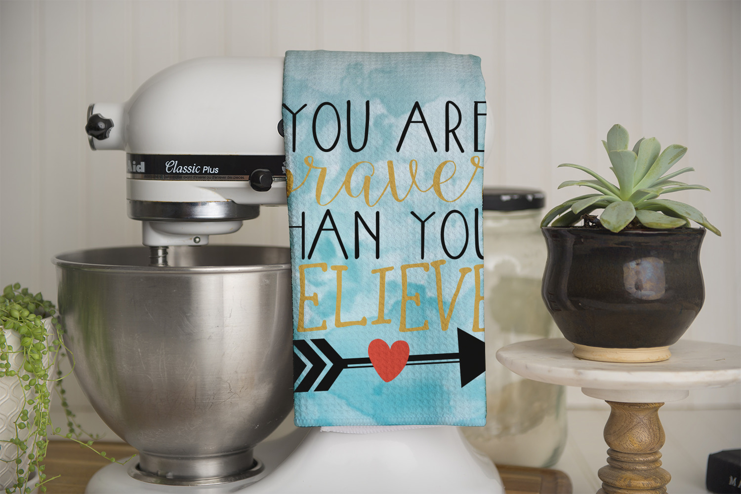 This design features one of our many inspirational quotes. This quote in particular reminds you that "you are braver than you believe." This uplifting quote has beatuiful and playful fonts to create it. An arrow sits below the quote to symbolize the bravery of the heart. The background is a lovely hombre watercolor pattern of teal/turquoise and peach. The calming colors make for a lovely inspirational design.