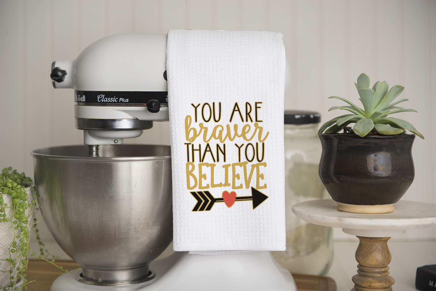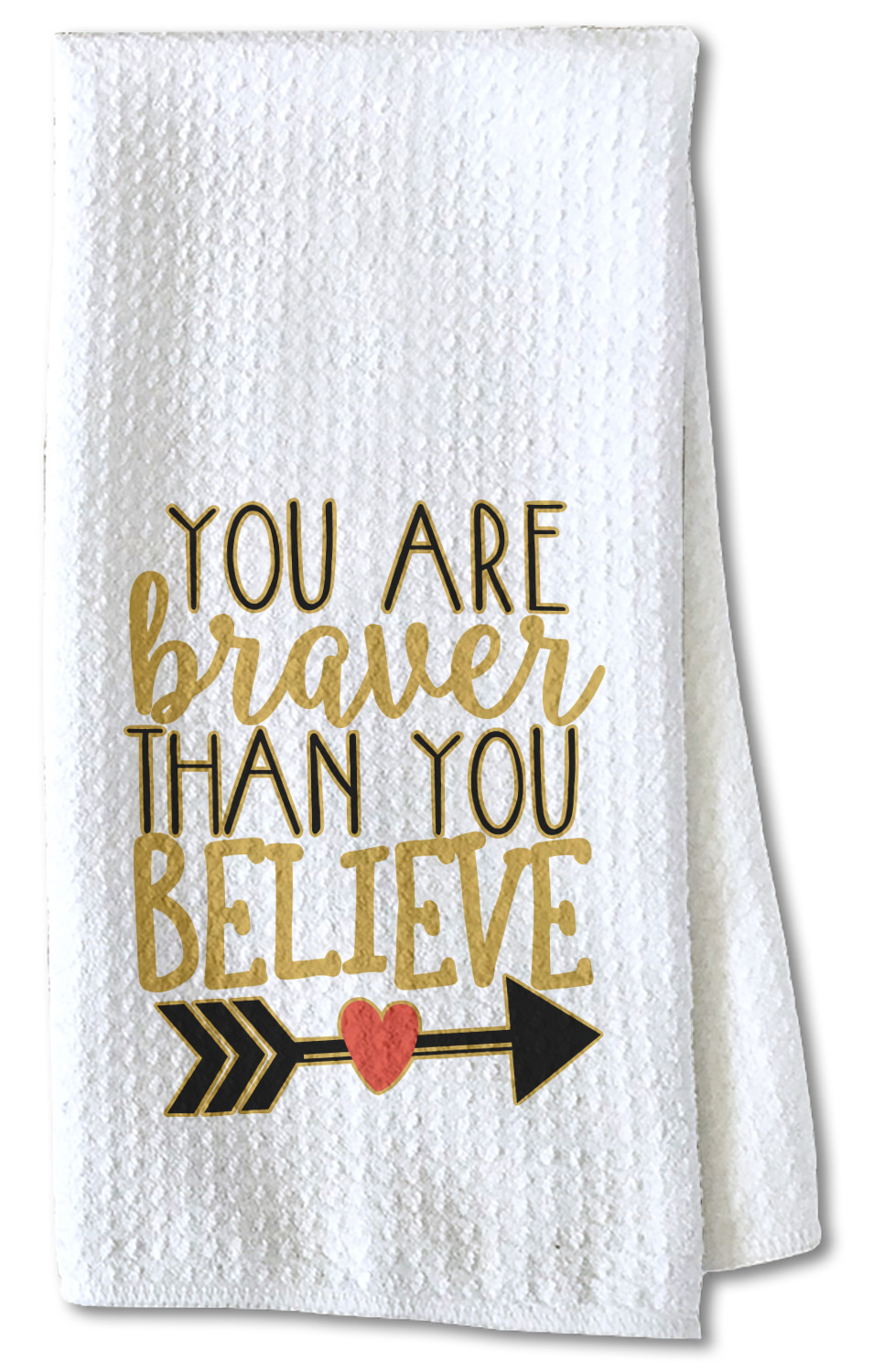 This design features one of our many inspirational quotes. This quote in particular reminds you that "you are braver than you believe." This uplifting quote has beatuiful and playful fonts to create it. An arrow sits below the quote to symbolize the bravery of the heart. The background is a lovely hombre watercolor pattern of teal/turquoise and peach. The calming colors make for a lovely inspirational design.