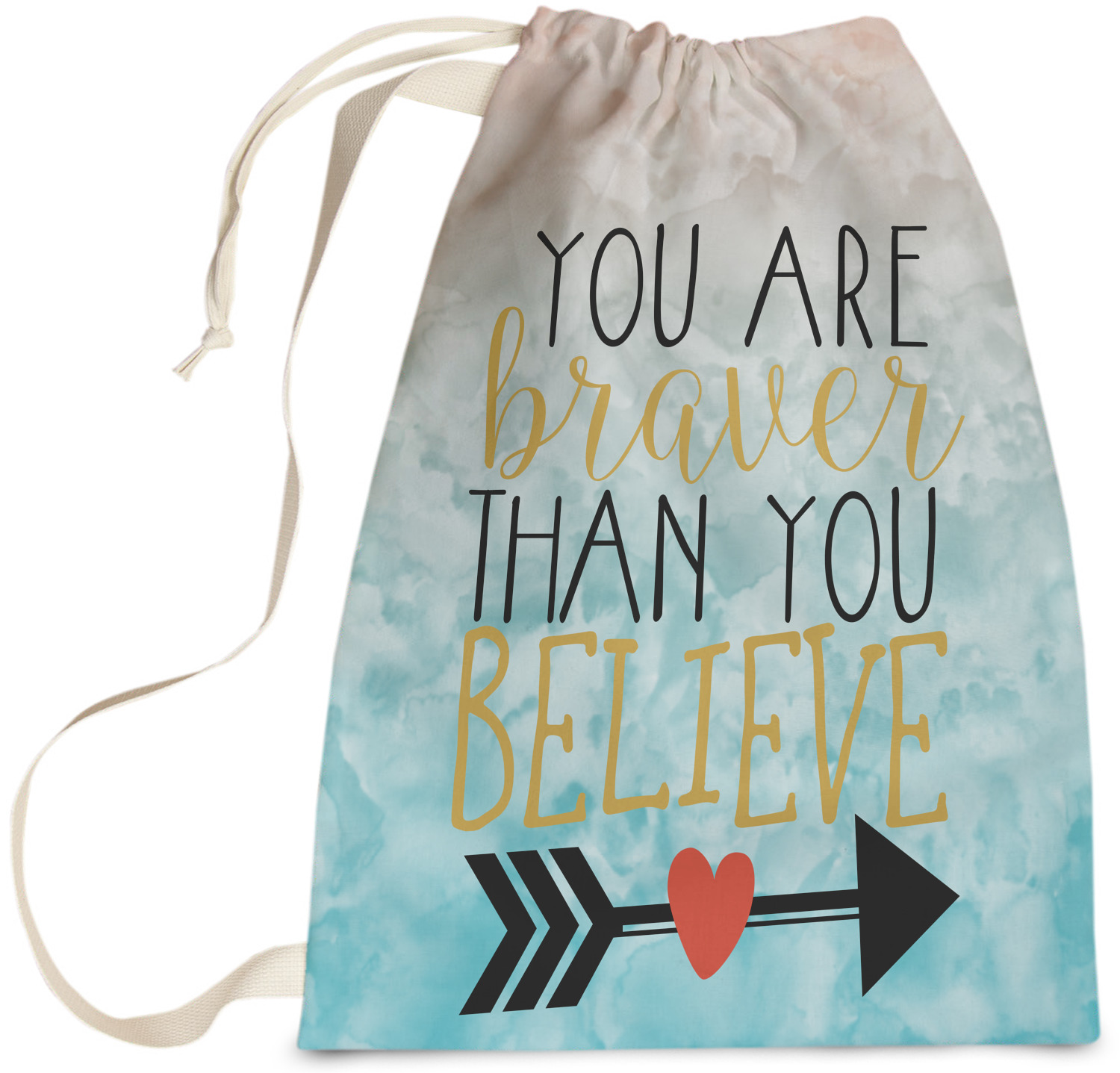 This design features one of our many inspirational quotes. This quote in particular reminds you that "you are braver than you believe." This uplifting quote has beatuiful and playful fonts to create it. An arrow sits below the quote to symbolize the bravery of the heart. The background is a lovely hombre watercolor pattern of teal/turquoise and peach. The calming colors make for a lovely inspirational design.