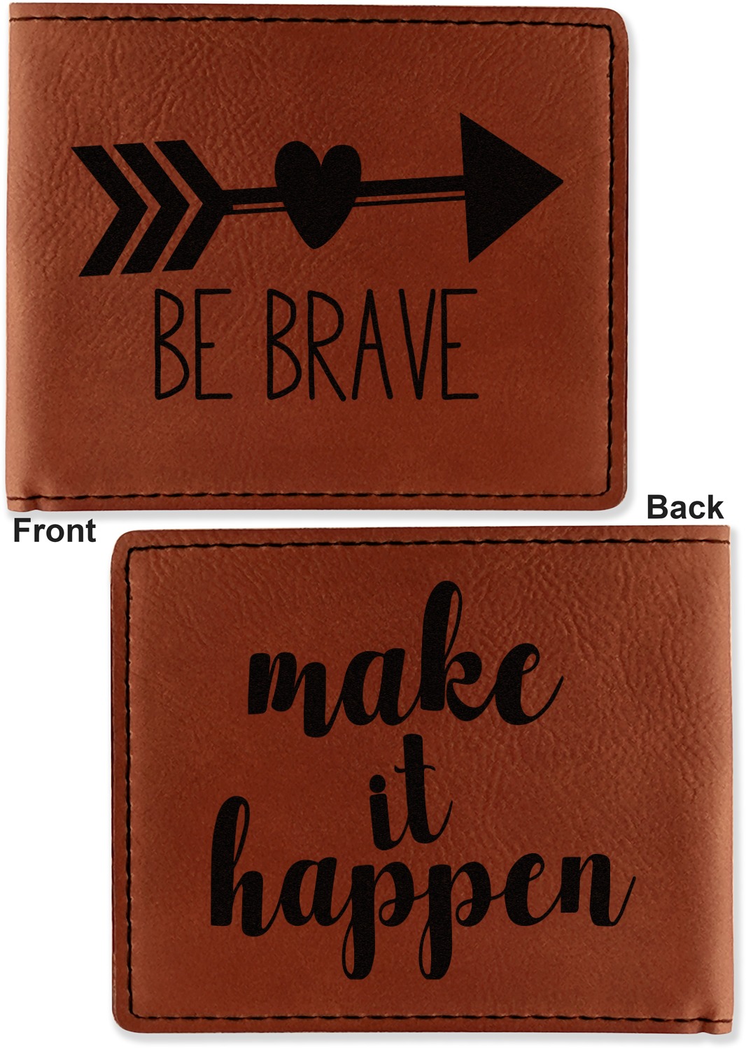 Your bifold wallet will be personalized by laser engraving, which will be a black color on the wallet. Choose a graphic, text, or monogram to personalize your wallet. There are thousands of choices in our design center.