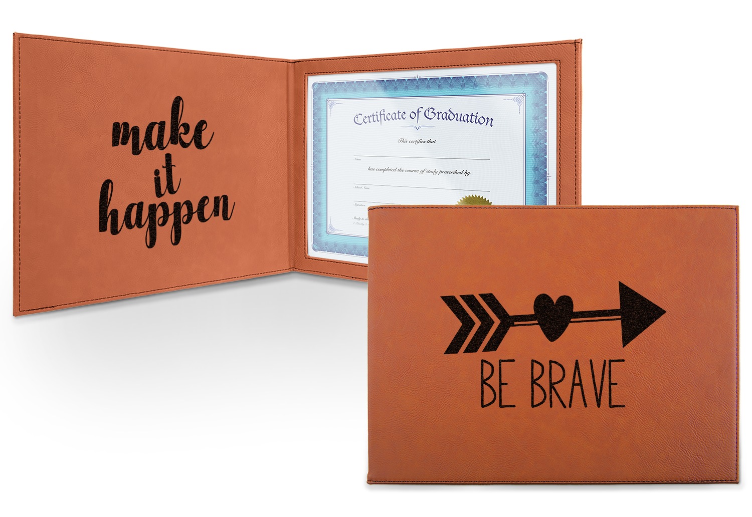 This cognac-colored, leatherette certificate jacket is the ideal way to display or store your hard-earned certificate. When closed, the custom certificate holder measures at 12 by 9 inches. The interior of the certificate cover includes a clear, vinyl window to encase your diploma. The window measures at around 10.5 by 7.5 inches and can accommodate a diploma that measures at up to 8.5 by 11 inches. You can either choose to have your customization laser engraved on the front and interior, or solely the front.