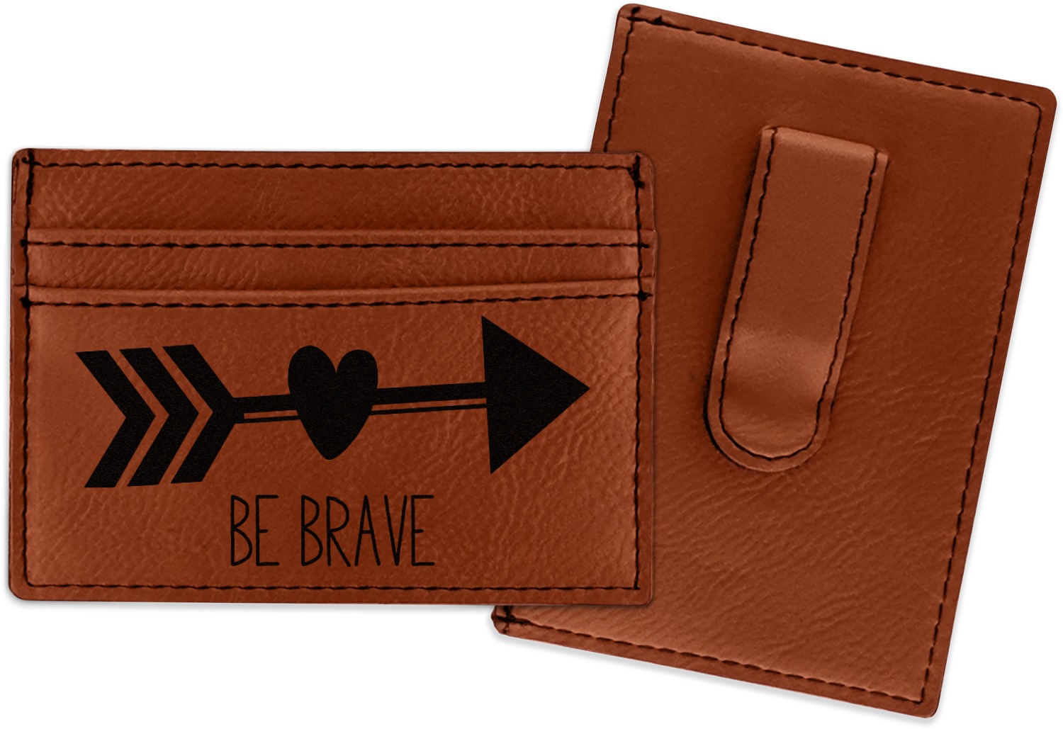 Made from a smooth brown leatherette material, these money clip wallets are the perfect accessory. They measure at approximately 4" x 2.75". On one side there is a money clip where you can slip in your cash. On the other side are three card slots for an ID and credit card or two. The money clip wallet will be laser engraved with your design on the side with the credit card slots. The graphic will come out as a black color.