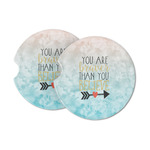 This design features one of our many inspirational quotes. This quote in particular reminds you that "you are braver than you believe." This uplifting quote has beatuiful and playful fonts to create it. An arrow sits below the quote to symbolize the bravery of the heart. The background is a lovely hombre watercolor pattern of teal/turquoise and peach. The calming colors make for a lovely inspirational design.