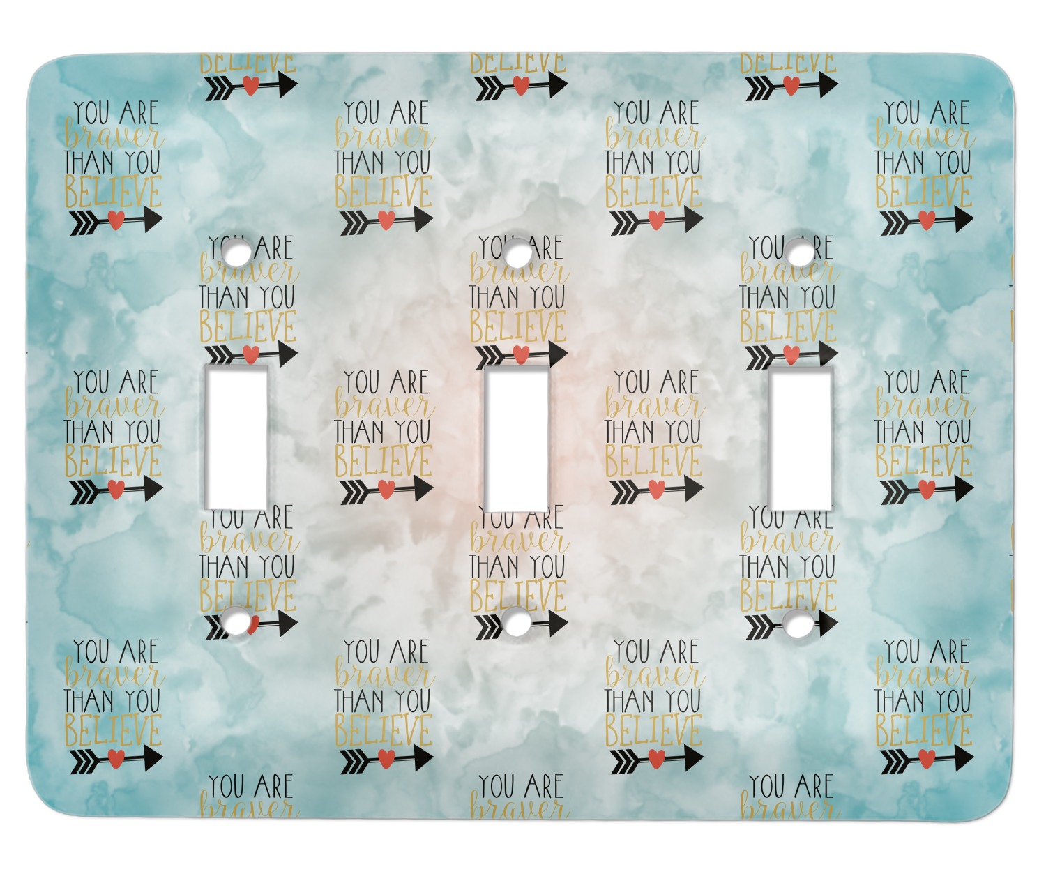 This design features one of our many inspirational quotes. This quote in particular reminds you that "you are braver than you believe." This uplifting quote has beatuiful and playful fonts to create it. An arrow sits below the quote to symbolize the bravery of the heart. The background is a lovely hombre watercolor pattern of teal/turquoise and peach. The calming colors make for a lovely inspirational design.