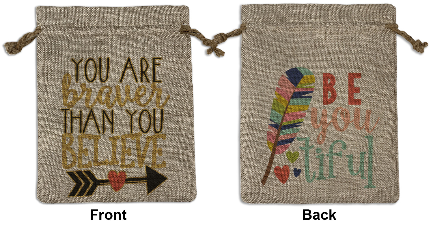 We sell our Burlap Gift Bags in 3 variant sized bags. Made with burlap polyester, each personalized bag can be secured with a twine drawstring pull. Your custom design is available to print on one side or both sides - completely up to you! The sizes of the bags measure approximately 4.5" x 6.5" for the smallest size, 6.5" x 8.0" for the medium size, and 6.5" x 13.5" for the large-sized bag.
