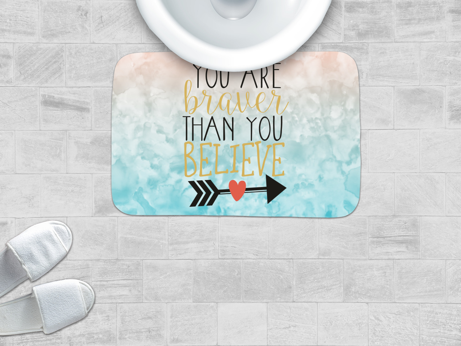 This design features one of our many inspirational quotes. This quote in particular reminds you that "you are braver than you believe." This uplifting quote has beatuiful and playful fonts to create it. An arrow sits below the quote to symbolize the bravery of the heart. The background is a lovely hombre watercolor pattern of teal/turquoise and peach. The calming colors make for a lovely inspirational design.