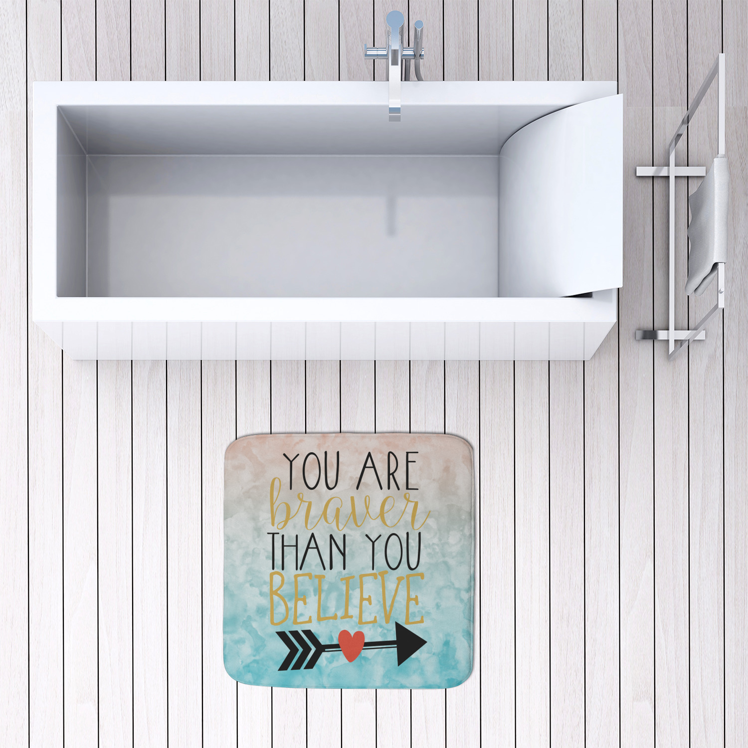 This design features one of our many inspirational quotes. This quote in particular reminds you that "you are braver than you believe." This uplifting quote has beatuiful and playful fonts to create it. An arrow sits below the quote to symbolize the bravery of the heart. The background is a lovely hombre watercolor pattern of teal/turquoise and peach. The calming colors make for a lovely inspirational design.