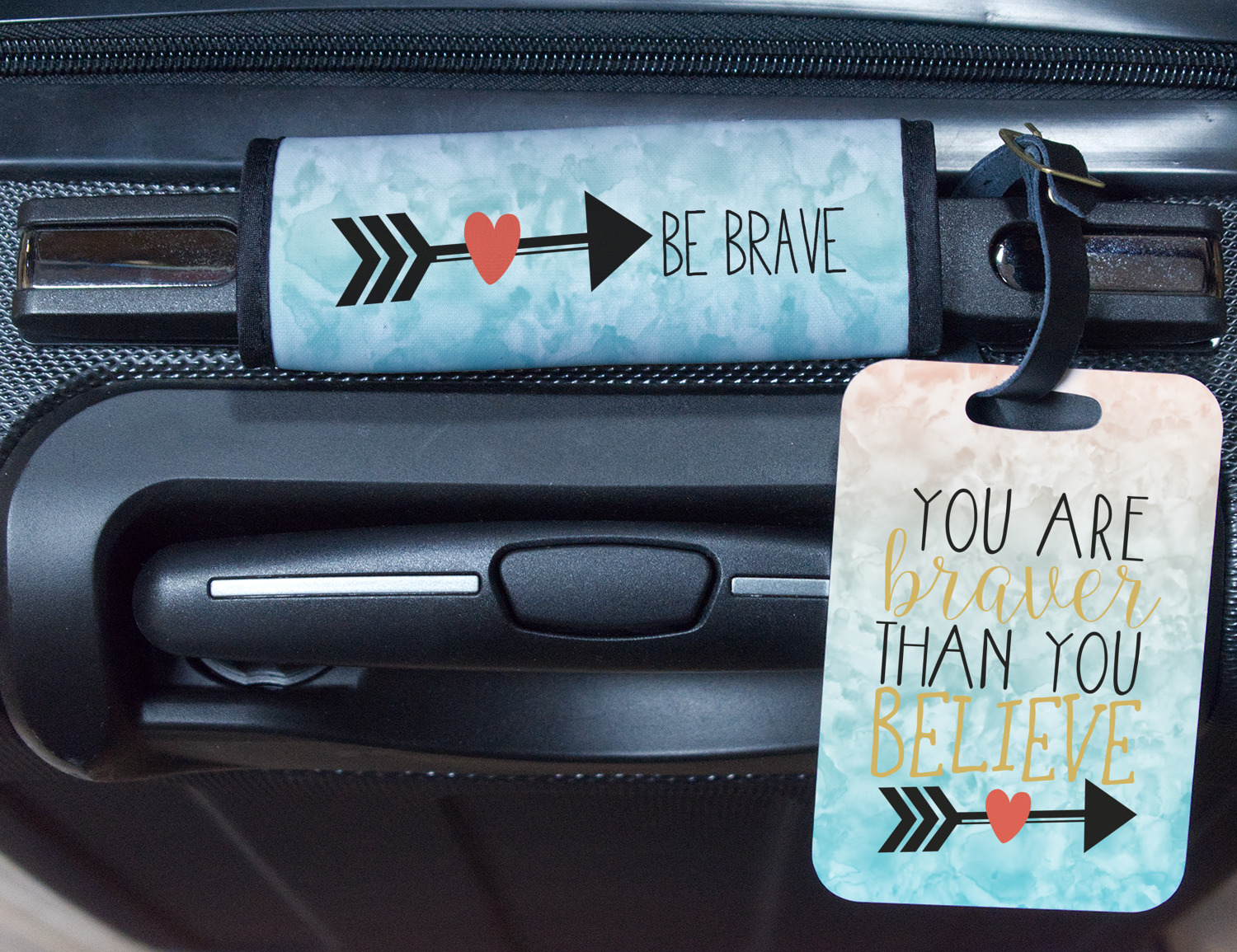 This design features one of our many inspirational quotes. This quote in particular reminds you that "you are braver than you believe." This uplifting quote has beatuiful and playful fonts to create it. An arrow sits below the quote to symbolize the bravery of the heart. The background is a lovely hombre watercolor pattern of teal/turquoise and peach. The calming colors make for a lovely inspirational design.