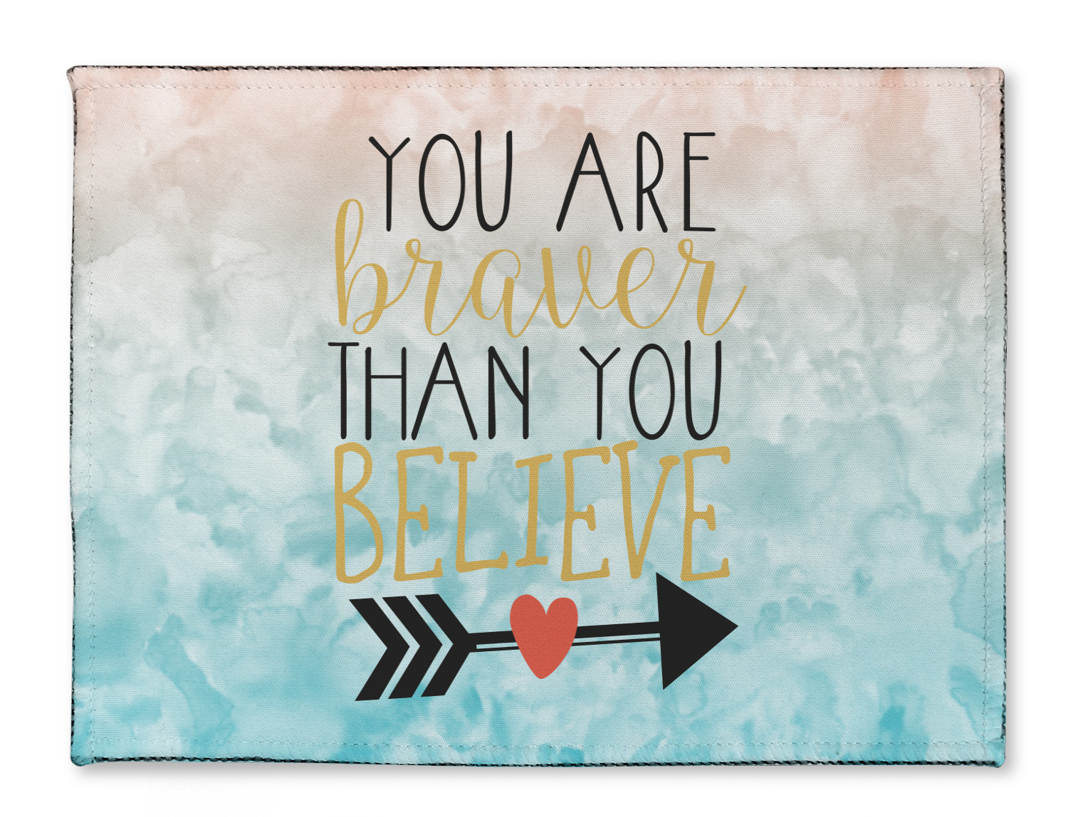 This design features one of our many inspirational quotes. This quote in particular reminds you that "you are braver than you believe." This uplifting quote has beatuiful and playful fonts to create it. An arrow sits below the quote to symbolize the bravery of the heart. The background is a lovely hombre watercolor pattern of teal/turquoise and peach. The calming colors make for a lovely inspirational design.