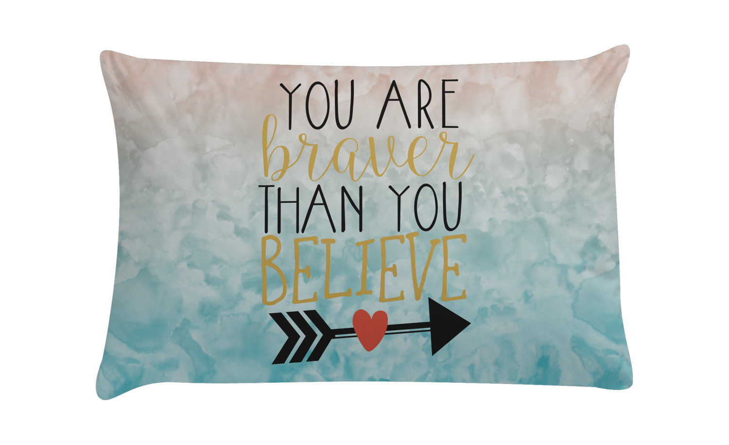This design features one of our many inspirational quotes. This quote in particular reminds you that "you are braver than you believe." This uplifting quote has beatuiful and playful fonts to create it. An arrow sits below the quote to symbolize the bravery of the heart. The background is a lovely hombre watercolor pattern of teal/turquoise and peach. The calming colors make for a lovely inspirational design.