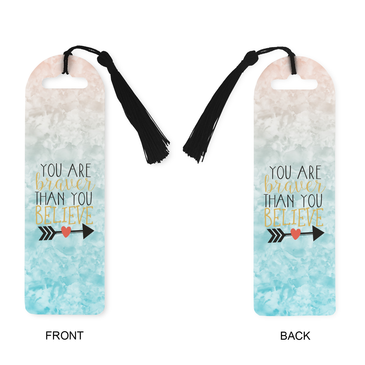This design features one of our many inspirational quotes. This quote in particular reminds you that "you are braver than you believe." This uplifting quote has beatuiful and playful fonts to create it. An arrow sits below the quote to symbolize the bravery of the heart. The background is a lovely hombre watercolor pattern of teal/turquoise and peach. The calming colors make for a lovely inspirational design.