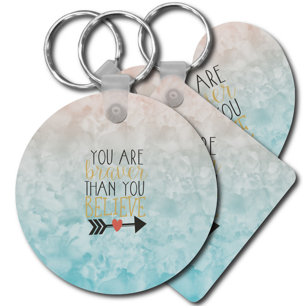 Our personalized keychains attach to the included metal, split key ring with a plastic, removable snap. Since a metal ring is included with your purchase, you have the liberty to keep your keys together on the ring, with or without your unique keychain. We offer this keychain in three different shapes: circle, heart, or diamond. We print your personalized design(s) on both sides of the key chain, and the surface has a glossy, reflective finish that only emphasizes your design. Each keychain is approximately 2.25 by 2.25 inches.