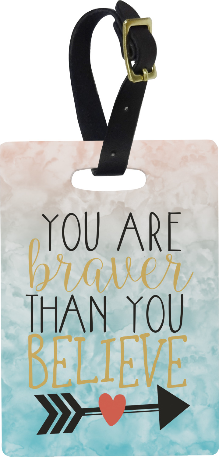 This design features one of our many inspirational quotes. This quote in particular reminds you that "you are braver than you believe." This uplifting quote has beatuiful and playful fonts to create it. An arrow sits below the quote to symbolize the bravery of the heart. The background is a lovely hombre watercolor pattern of teal/turquoise and peach. The calming colors make for a lovely inspirational design.