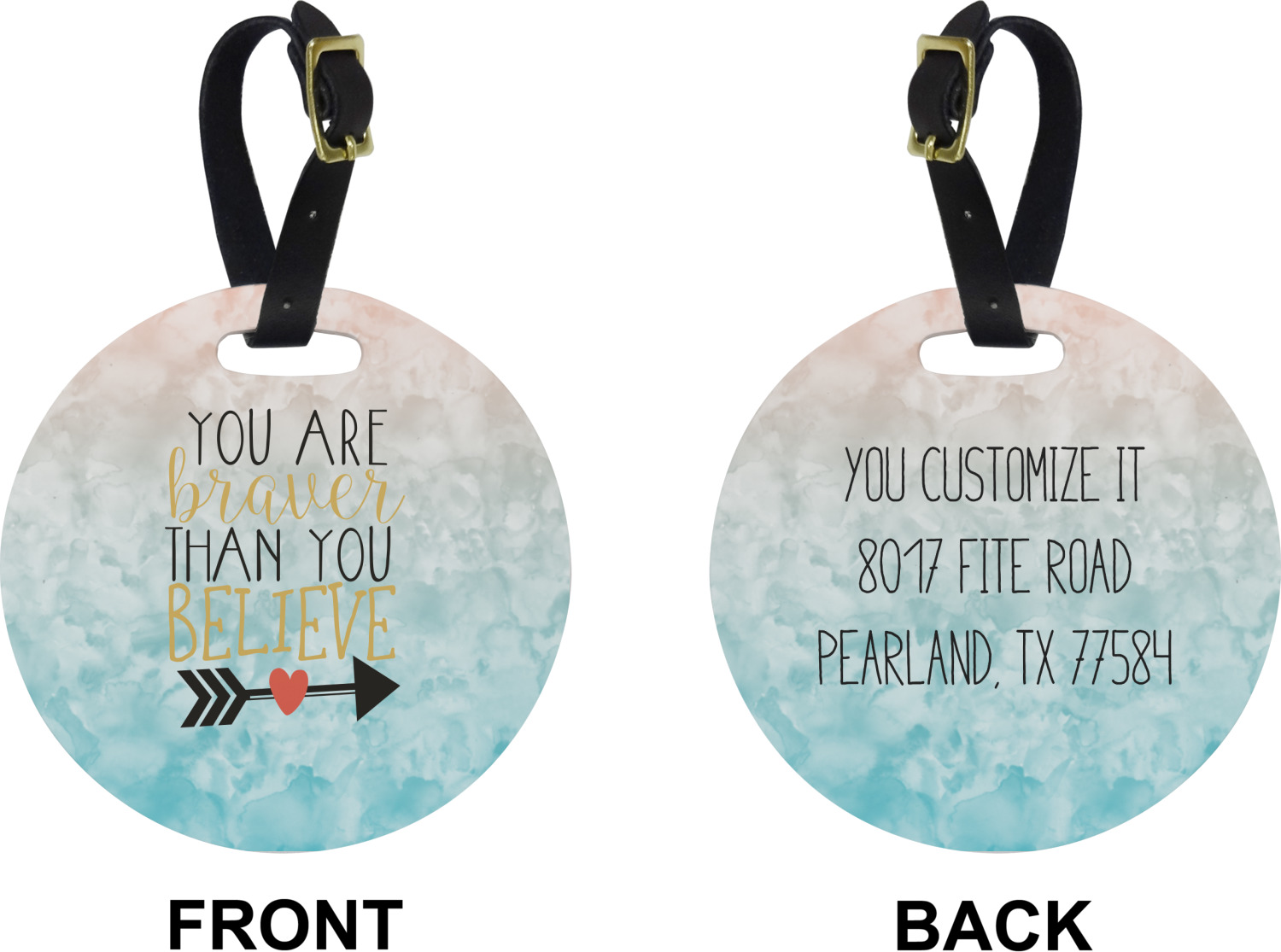 These cute luggage tags are made of a fiber-reinforced, UV-resistant plastic, making them waterproof and durable enough for both everyday use and the rugged adventures of any traveler! A leather strap with holes and a buckle is included with your purchase and can be used to attach your custom luggage tag to any suitcase, backpack, or duffel bag. You can design these travel tags as you wish; your customization will be displayed across the front, while the back will show as little or as much personal information as you want.