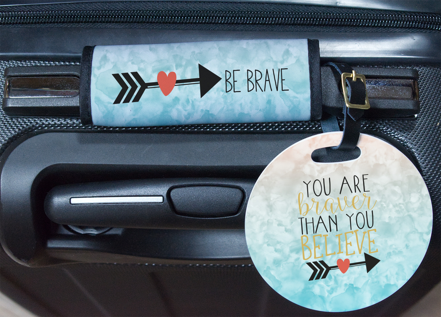 This design features one of our many inspirational quotes. This quote in particular reminds you that "you are braver than you believe." This uplifting quote has beatuiful and playful fonts to create it. An arrow sits below the quote to symbolize the bravery of the heart. The background is a lovely hombre watercolor pattern of teal/turquoise and peach. The calming colors make for a lovely inspirational design.