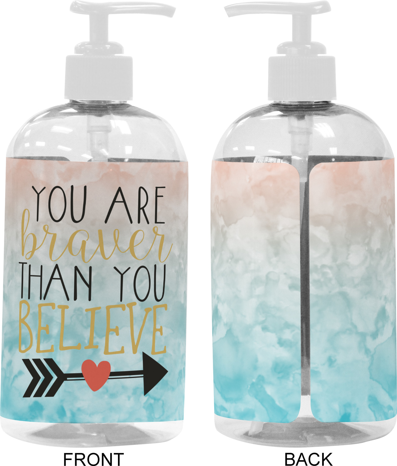 This design features one of our many inspirational quotes. This quote in particular reminds you that "you are braver than you believe." This uplifting quote has beatuiful and playful fonts to create it. An arrow sits below the quote to symbolize the bravery of the heart. The background is a lovely hombre watercolor pattern of teal/turquoise and peach. The calming colors make for a lovely inspirational design.