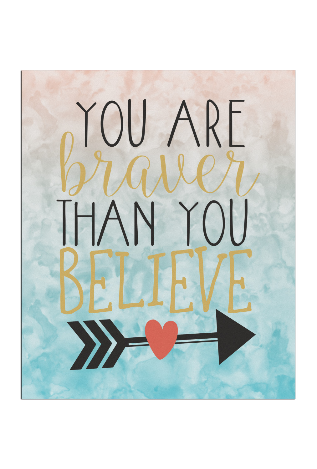 This design features one of our many inspirational quotes. This quote in particular reminds you that "you are braver than you believe." This uplifting quote has beatuiful and playful fonts to create it. An arrow sits below the quote to symbolize the bravery of the heart. The background is a lovely hombre watercolor pattern of teal/turquoise and peach. The calming colors make for a lovely inspirational design.