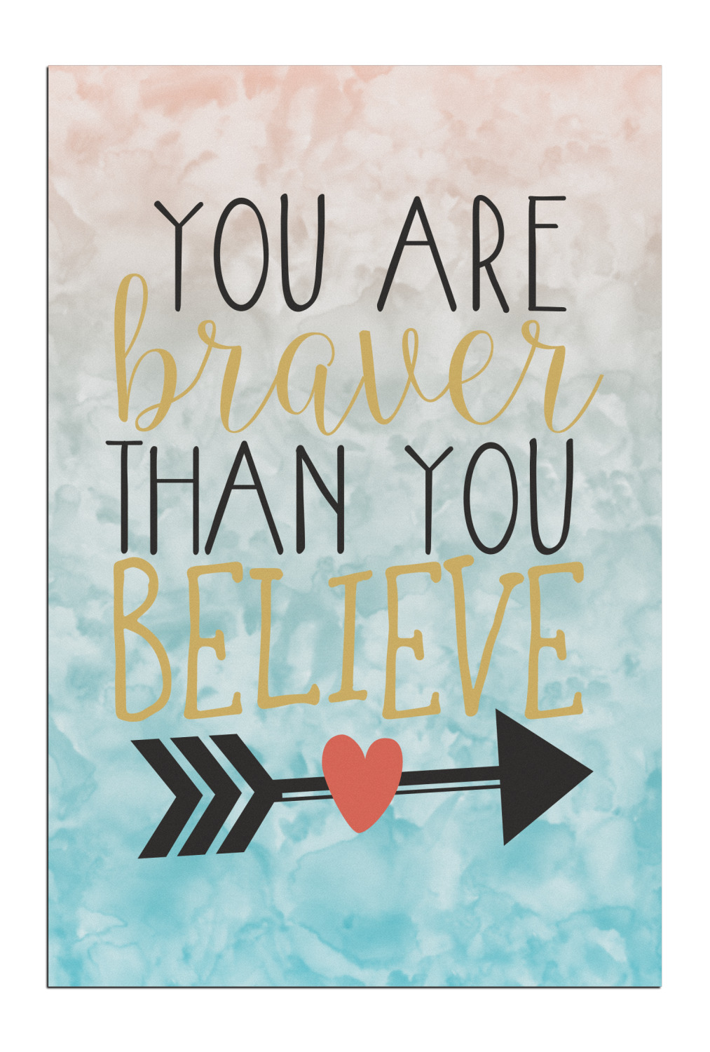 This design features one of our many inspirational quotes. This quote in particular reminds you that "you are braver than you believe." This uplifting quote has beatuiful and playful fonts to create it. An arrow sits below the quote to symbolize the bravery of the heart. The background is a lovely hombre watercolor pattern of teal/turquoise and peach. The calming colors make for a lovely inspirational design.