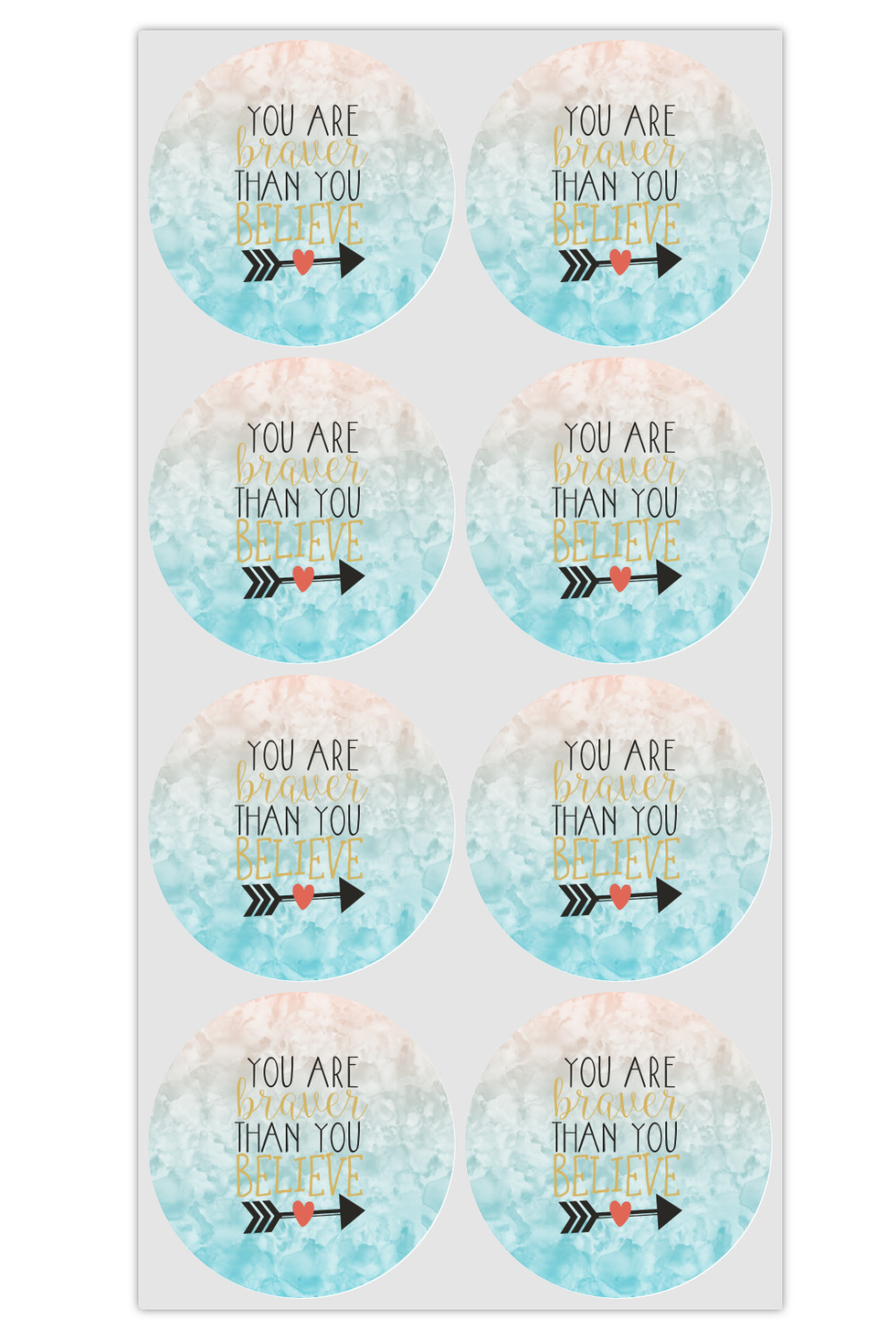 This design features one of our many inspirational quotes. This quote in particular reminds you that "you are braver than you believe." This uplifting quote has beatuiful and playful fonts to create it. An arrow sits below the quote to symbolize the bravery of the heart. The background is a lovely hombre watercolor pattern of teal/turquoise and peach. The calming colors make for a lovely inspirational design.