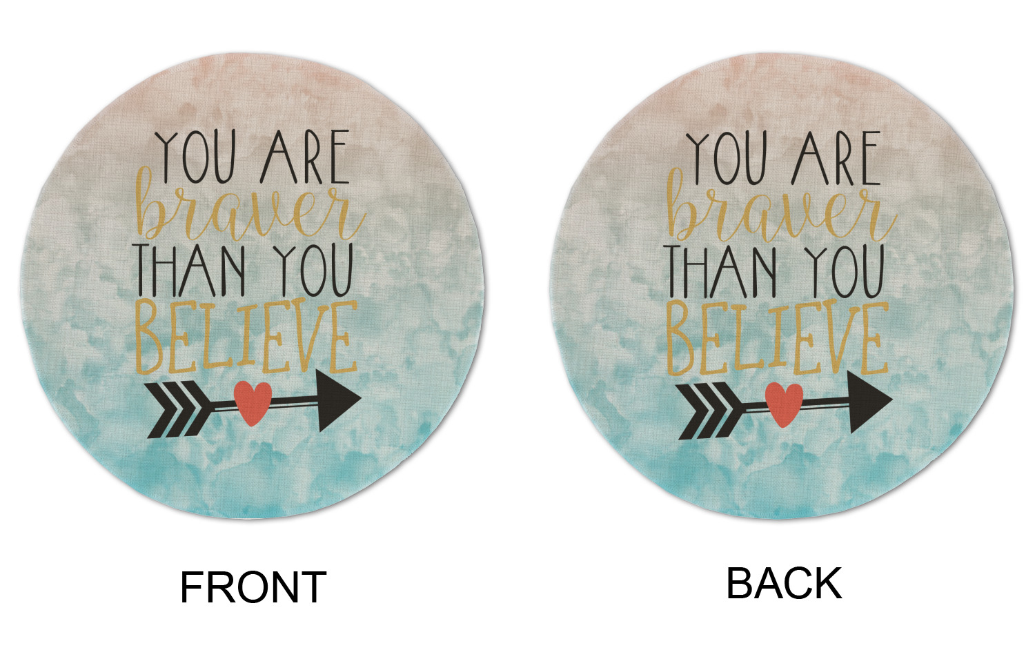 This design features one of our many inspirational quotes. This quote in particular reminds you that "you are braver than you believe." This uplifting quote has beatuiful and playful fonts to create it. An arrow sits below the quote to symbolize the bravery of the heart. The background is a lovely hombre watercolor pattern of teal/turquoise and peach. The calming colors make for a lovely inspirational design.