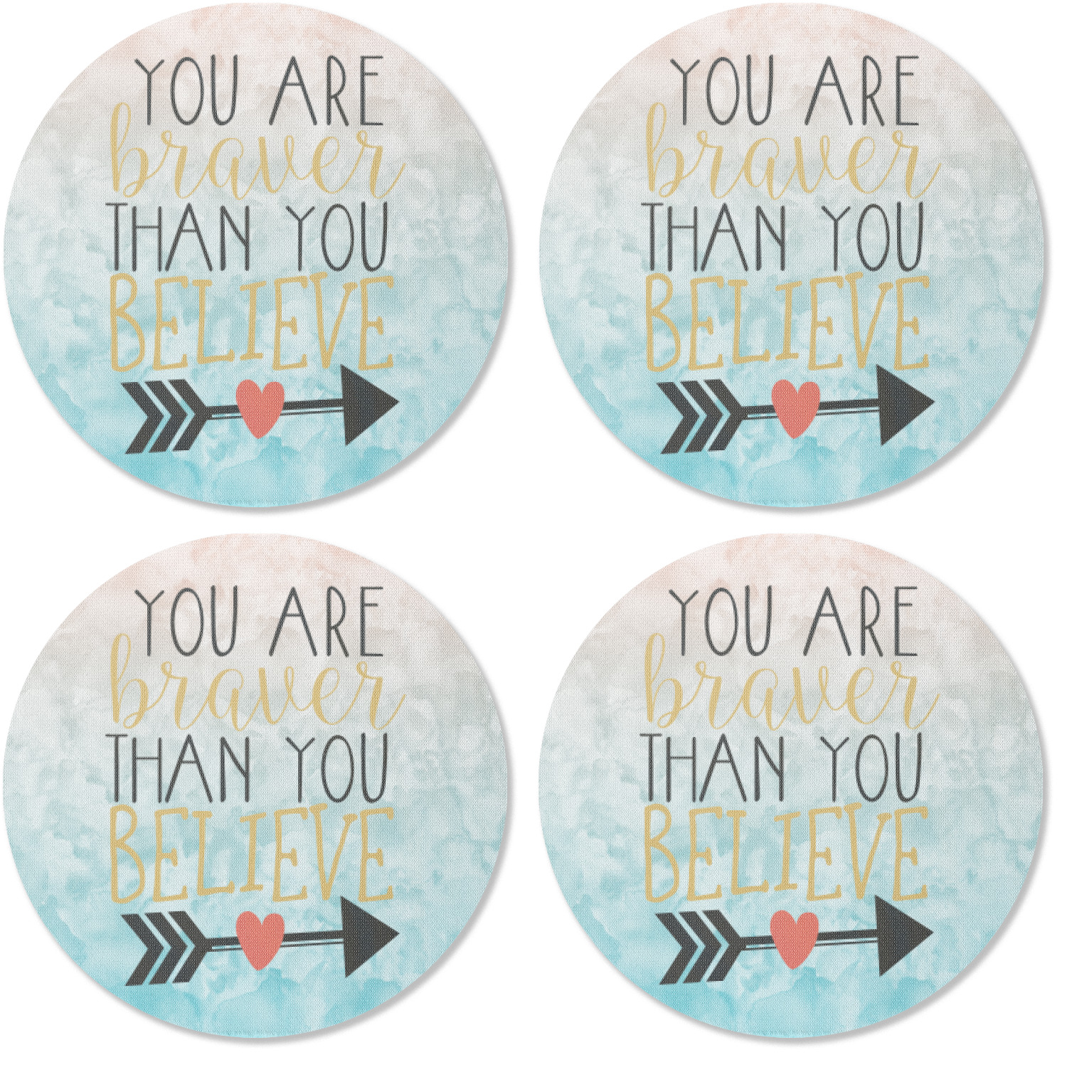 This design features one of our many inspirational quotes. This quote in particular reminds you that "you are braver than you believe." This uplifting quote has beatuiful and playful fonts to create it. An arrow sits below the quote to symbolize the bravery of the heart. The background is a lovely hombre watercolor pattern of teal/turquoise and peach. The calming colors make for a lovely inspirational design.