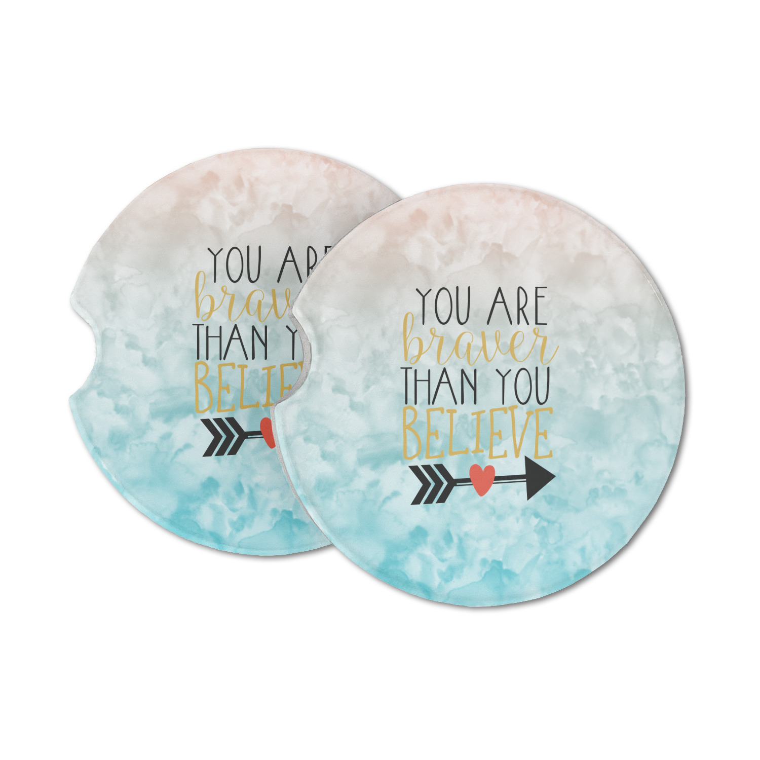 This design features one of our many inspirational quotes. This quote in particular reminds you that "you are braver than you believe." This uplifting quote has beatuiful and playful fonts to create it. An arrow sits below the quote to symbolize the bravery of the heart. The background is a lovely hombre watercolor pattern of teal/turquoise and peach. The calming colors make for a lovely inspirational design.
