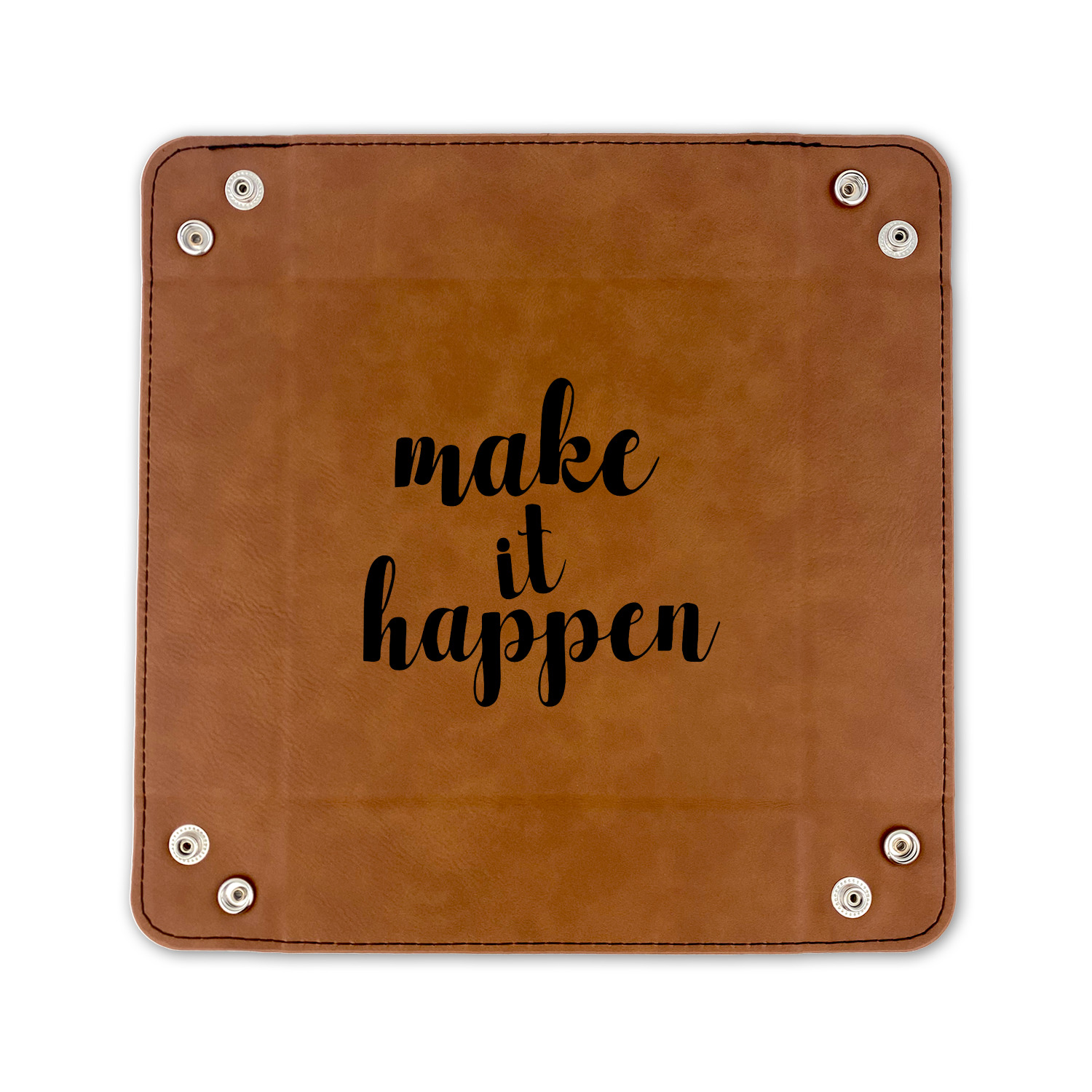 The leatherette wraps the hard board base and sides with flexible hinges to fold the sides up. The corners are secured using silver snaps. The 6in x 6 in tray measures approximately 9.5in x 9.5in when laid flat. The 9in x 9in tray measures approximately 13in x 13in when laid flat.