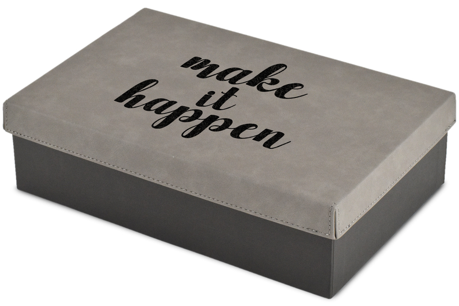 These gift boxes are available in 3 different sizes to accommodate various sized gifts. Available in gray as a neutral color for any occasion as well as to showcase your design boldly. Engraved with a laser this high quality paper board and faux leather gift box is unique and makes any gift stand out.