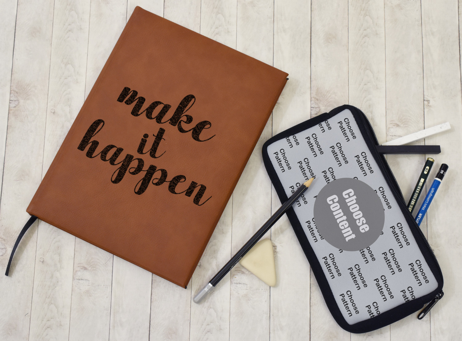 The faux leather covers are a rich cognac / rawhide color and can be customized with your design. From a simple name or monogram or a logo to a detailed mandala - the choice for customization & personalization is truly yours. Customize one of our designs or upload your own.