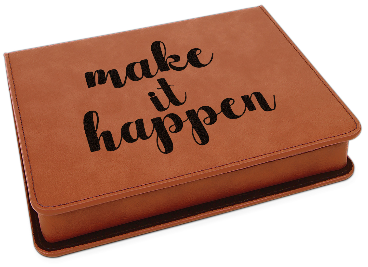 This set includes a wine stopper, pourer, drip ring, and a corkscrew! The exterior of the box is a gorgeous, cognac-brown leatherette, while the interior is covered in a black, velvety material. Four foam indentations, unique to the shape of the wine tool, are found at the bottom half of the box's interior. The tools fit snugly into each of their designated spots, and the foam material helps to protect the integrity of your tools. Each of the wine gadgets features a bamboo accent, with the location and style depending on the tool itself. We laser engrave your personalized design onto the lid of the box, which easily flips open and is secured closed by a small magnet. The wine accessories box measures at 7 by 5.5 inches in total.