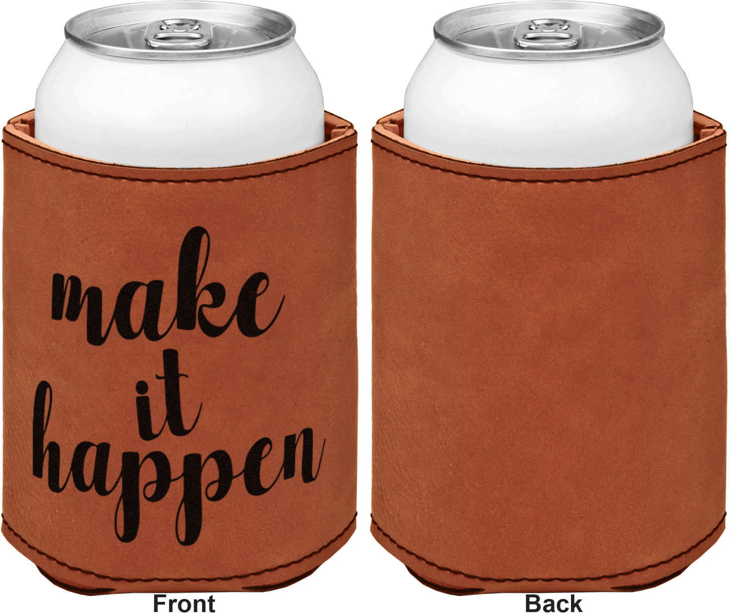 This can sleeve is made from a cognac-brown leatherette and stitched with a sturdy, black thread. A slim padding lines the inside of your can sleeve to allow for a better fit once your drink is inserted. The sleeve itself measures at 4 by 4.5 inches, allowing this custom can sleeve to accommodate most canned drinks. Your personalized design can be engraved on the front and back, or solely the front. When laser-engraved, your design appears as a black coloration which contrasts the leatherette nicely.