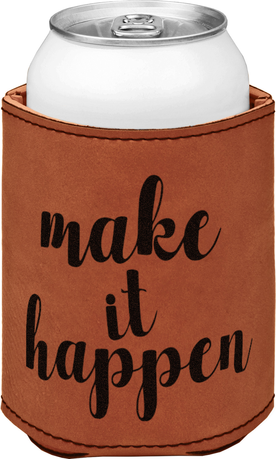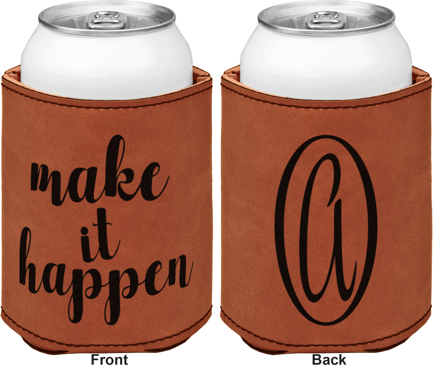 This can sleeve is made from a cognac-brown leatherette and stitched with a sturdy, black thread. A slim padding lines the inside of your can sleeve to allow for a better fit once your drink is inserted. The sleeve itself measures at 4 by 4.5 inches, allowing this custom can sleeve to accommodate most canned drinks. Your personalized design can be engraved on the front and back, or solely the front. When laser-engraved, your design appears as a black coloration which contrasts the leatherette nicely.