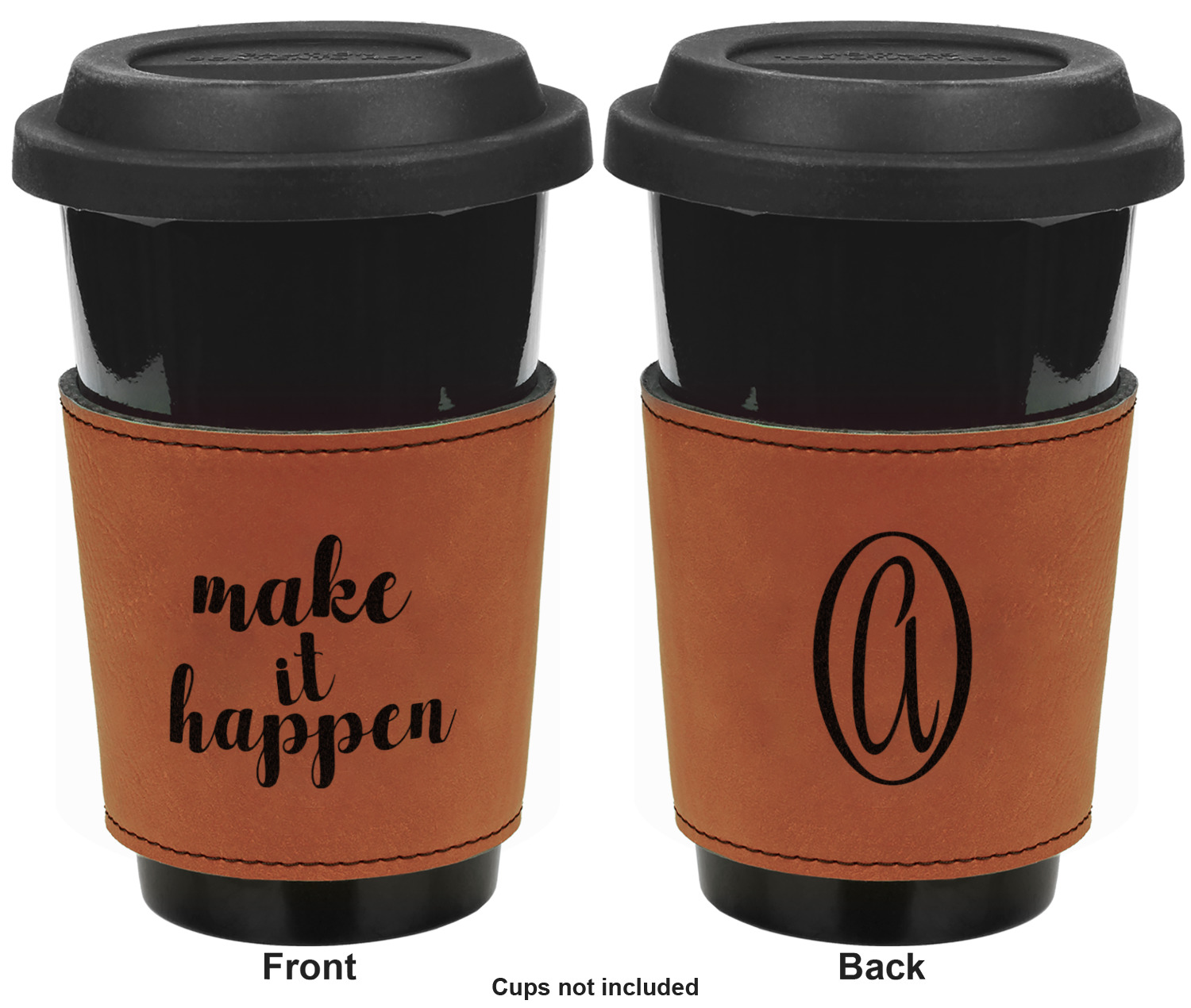 This cup sleeve is made from a suave, cognac-brown leatherette and finished with an intricate, black stitch. The interior of this can sleeve is fabricated from a thin foam material to help insulate your mug's contents. The sleeve is specifically made to suit tapered glasses or mugs, so the top's diameter is 3.5 inches, while the bottom's diameter is 2.75 inches. Your customized design will be laser engraved into the leatherette, leaving behind crisp, black imprint. With these products, we provide you with the option of engraving the front and back, or the front only.