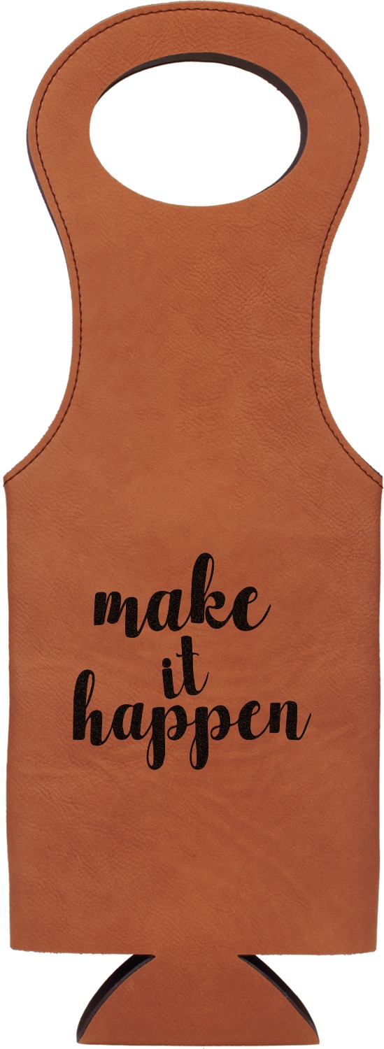 This wine carrier is made from a stunning leatherette, in a cognac-brown color. Strong, black stitching lines the sides of your wine bottle bag and provides extra durability. The interior is lined with a padded, black material to allow for a snug fit once your bottle is placed inside. At the top of this wine gift bag, you'll find two oval shaped handles that elegantly complements the rest of the bag's style. We provide you with the option of laser-engraving the front, or the front and back of your new personalized wine bag!