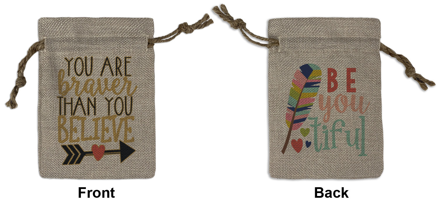 We sell our Burlap Gift Bags in 3 variant sized bags. Made with burlap polyester, each personalized bag can be secured with a twine drawstring pull. Your custom design is available to print on one side or both sides - completely up to you! The sizes of the bags measure approximately 4.5" x 6.5" for the smallest size, 6.5" x 8.0" for the medium size, and 6.5" x 13.5" for the large-sized bag.