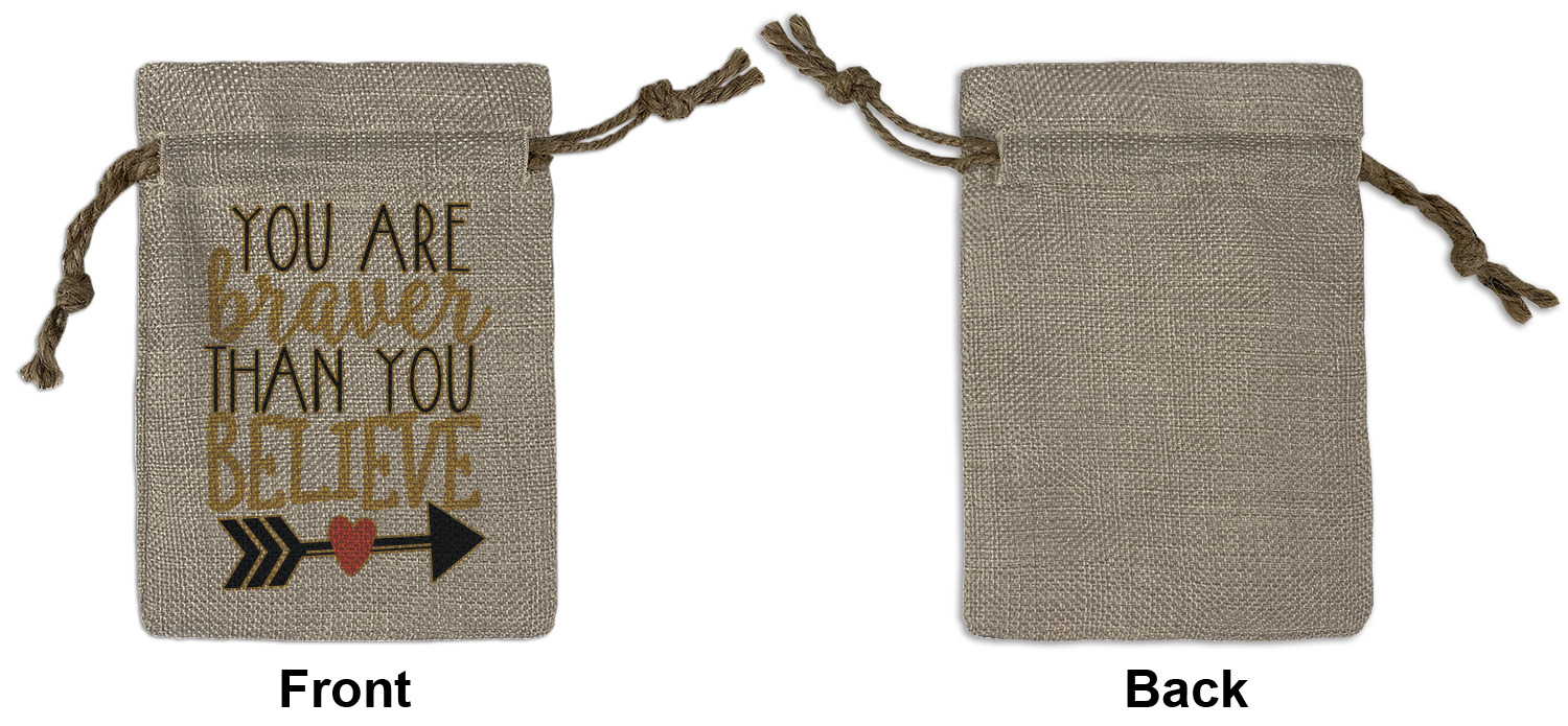 We sell our Burlap Gift Bags in 3 variant sized bags. Made with burlap polyester, each personalized bag can be secured with a twine drawstring pull. Your custom design is available to print on one side or both sides - completely up to you! The sizes of the bags measure approximately 4.5" x 6.5" for the smallest size, 6.5" x 8.0" for the medium size, and 6.5" x 13.5" for the large-sized bag.