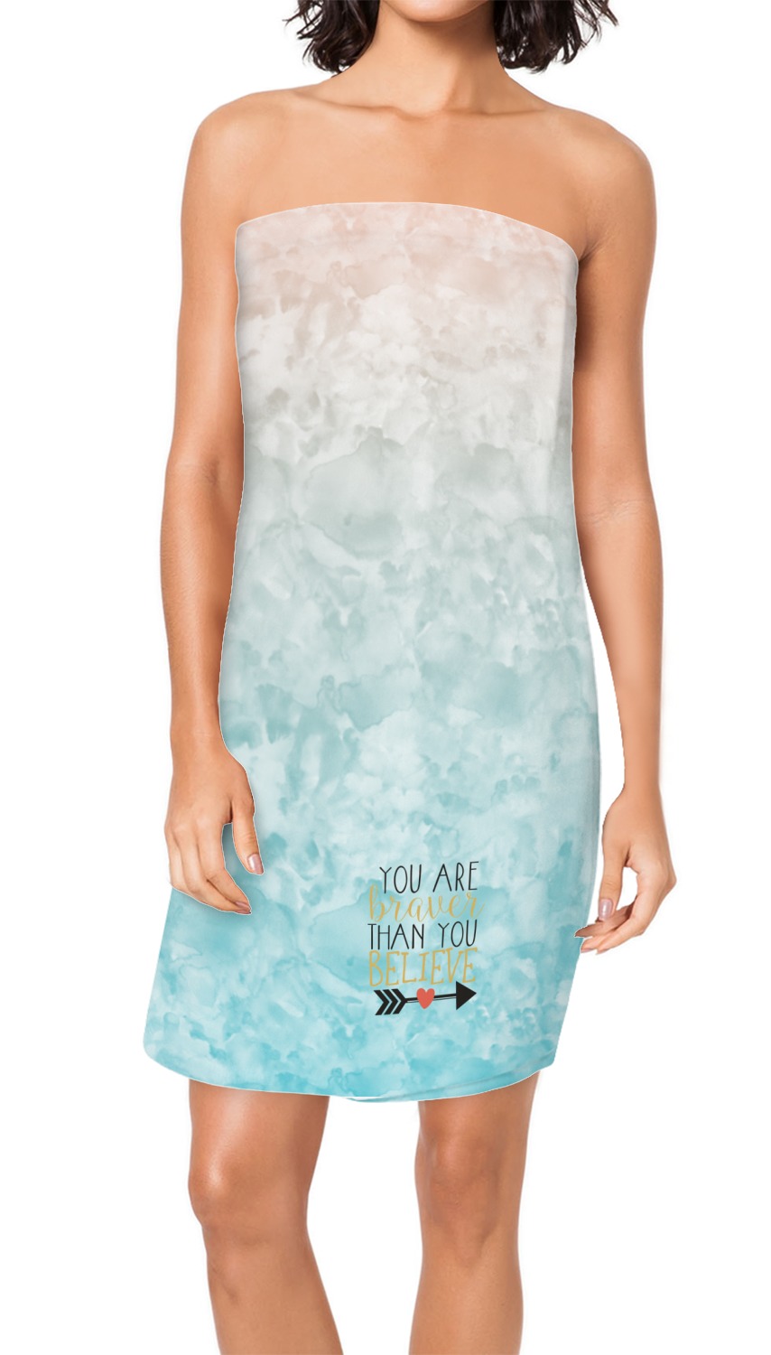This design features one of our many inspirational quotes. This quote in particular reminds you that "you are braver than you believe." This uplifting quote has beatuiful and playful fonts to create it. An arrow sits below the quote to symbolize the bravery of the heart. The background is a lovely hombre watercolor pattern of teal/turquoise and peach. The calming colors make for a lovely inspirational design.